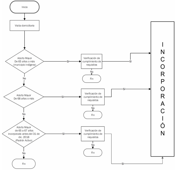 | Las personas adultas mayores de 65 a 67 años de edad, inscritas en el Padrón Activo de Beneficiarios del Programa Pensión para Adultos Mayores a diciembre del 2018. | 1. Estar en el Padrón Activo de Beneficiarios del Programa Pensión para Adultos Mayores, al mes de diciembre del ejercicio fiscal 2018. 2. Que estén incorporados en el Padrón Activo de Beneficiarios. |