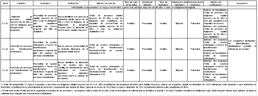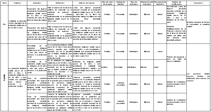 | Personas indígenas adultas mayores de 65 años o más de edad, mexicanas por nacimiento que residan en la República Mexicana y en los municipios señalados en el catálogo anexo. | 1. Pertenecer a la Población Indígena. 2. Tener 65 años o más de edad. 3. Residir en la República Mexicana. 4. Domicilio en municipios catalogados como indígenas. |
