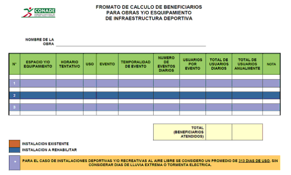 INDICAR DE MANERA PRECISA LA POBLACIÓN OBJETIVO QUE DE MANERA DIRECTA ATENDER A LA ACCIÓN DE OBRA Y/O EQUIPAMIENTO DEL PROYECTO DE QUE SE TRATE, OBTENIENDO DICHA CANTIDAD CON EL CALCULO DE AFORO PROMEDIO QUE TENDRÁ LA INSTALACIÓN DEPORTIVA EN UN DÍA, MULTIPLICÁNDOLO POR LOS DÍAS QUE DARA SERVICIO LA MISMA EN UN AÑO CALENDARIO, OBTENIENDO ASÍ LOS BENEFICIARIOS ANUALES, ESTABLECIENDO QUE EN LA DETERMINACIÓN DE LOS BENEFICIARIOS NO HABRÁ RANGO DE EDADES, DISTINCIÓN DE SEXO, EXCLUSIÓN POR AFILIACIÓN POLÍTICA O PRACTICA RELIGIOSA, PREFERENCIAS SEXUALES, CONDICIONAMIENTOS POR NIVEL ECONÓMICO Y EDUCATIVO Y MUCHO MENOS DISCRIMINACIÓN POR LIMITANTES FÍSICOS Y DISCAPACIDADES, CONCLUYENDO EN QUE LAS INSTALACIONES DEPORTIVAS ESTARÁN A LA DISPOSICIÓN DEL 100% DE LOS USUARIOS QUE CUMPLAN CON LAS REGLAS DE USO Y OPERACIÓN DE LAS INSTALACIONES, ESPACIOS Y/O EQUIPAMIENTOS DE QUE SE TRATE. EN EL SIGUIENTE CUADRO ANALÍTICO QUE SIRVE DE APOYO PARA CALCULO DE BENEFICIARIOS.