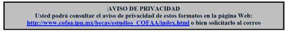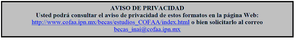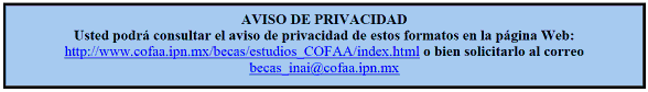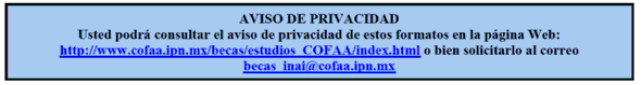 Usted podrá consultar el aviso de privacidad de estos formatos en la página web http://www.cofaa.ipn.mx/becas/exclusividad/index.html o bien solicitarlo al correo becas_inai@cofaa.ipn.mx
