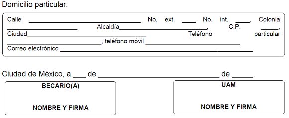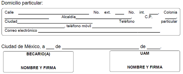 | ANEXAR: · COPIA DE LA CLAVE ÚNICA DE REGISTRO DE POBLACIÓN (CURP). · RESULTADO DEL EXAMEN DE COLOCACIÓN EMITIDO POR LA INSTITUCIÓN SELECCIONADA. · COPIA DE IDENTIFICACIÓN OFICIAL O CREDENCIAL VIGENTE DE ALUMNA(O) UAM. · CONSTANCIA DE ESTUDIOS CON CALIFICIONES, PROMEDIO Y PORCENTAJE DE CRÉDITOS. |