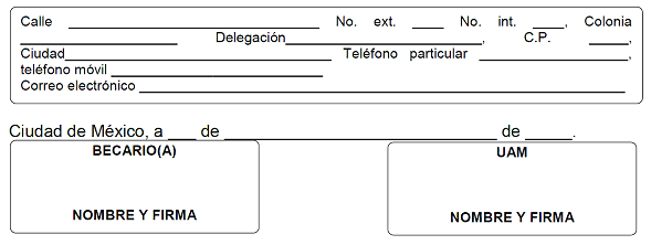 | BECAESTUDIO México D. F., a ____ de _______________ de ______ SECRETARIA O SECRETARIO O EJECUTIVO DE LA COMISIÓN DE OPERACIÓN Y FOMENTO DE ACTIVIDADES ACADÉMICAS DEL IPN P R E S E N T E El (la) que suscribe C. __________________________________________, con Clave Única de Registro de Población (CURP):______________________________, adscrito(a) a ____________________________________, me permito manifestarle que en caso de que el Comité Técnico para el Otorgamiento de Becas de Estudio Apoyos Económicos y Licencias con Goce de Sueldo (COTEBAL), me autorice la beca, para realizar estudios de ______________________, con especialidad en ___________________________, solicitada en el oficio número __________________________, emitido por el (la) __________________________________, me obligo a _______________________________________________________________________. En el entendido que en caso de incumplimiento dictaminado por el Comité Técnico para el Otorgamiento de Becas de Estudio, Apoyos Económicos y Licencias con Goce de Sueldo (COTEBAL), de alguna de las obligaciones mencionadas en la carta compromiso de fecha __________________________________________. suscrita por mí, así como cada una de las obligaciones contempladas en el Reglamento para el Otorgamiento de Becas de Estudio, Apoyos Económicos y Licencias con Goce de Sueldo en el Instituto Politécnico Nacional, debo y pagaré incondicionalmente a favor de la Comisión de Operación y Fomento de Actividades Académicas del IPN, el monto total de la beca otorgada, directamente en el área de Caja del Departamento de Tesorería de la COFAA-IPN, dentro de los treinta días posteriores al requerimiento efectuado por la COFAA-IPN ATENTAMENTE. |