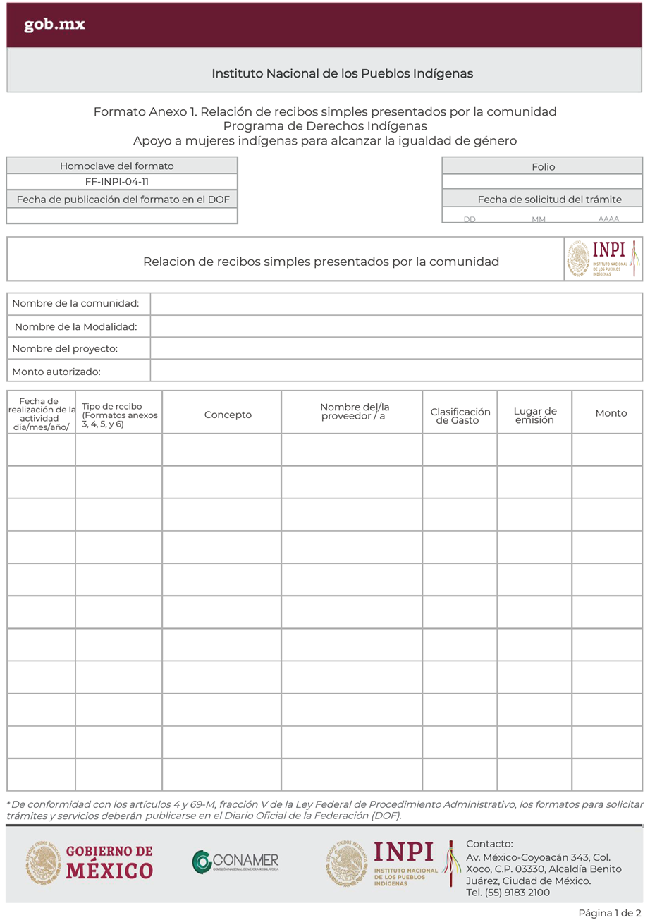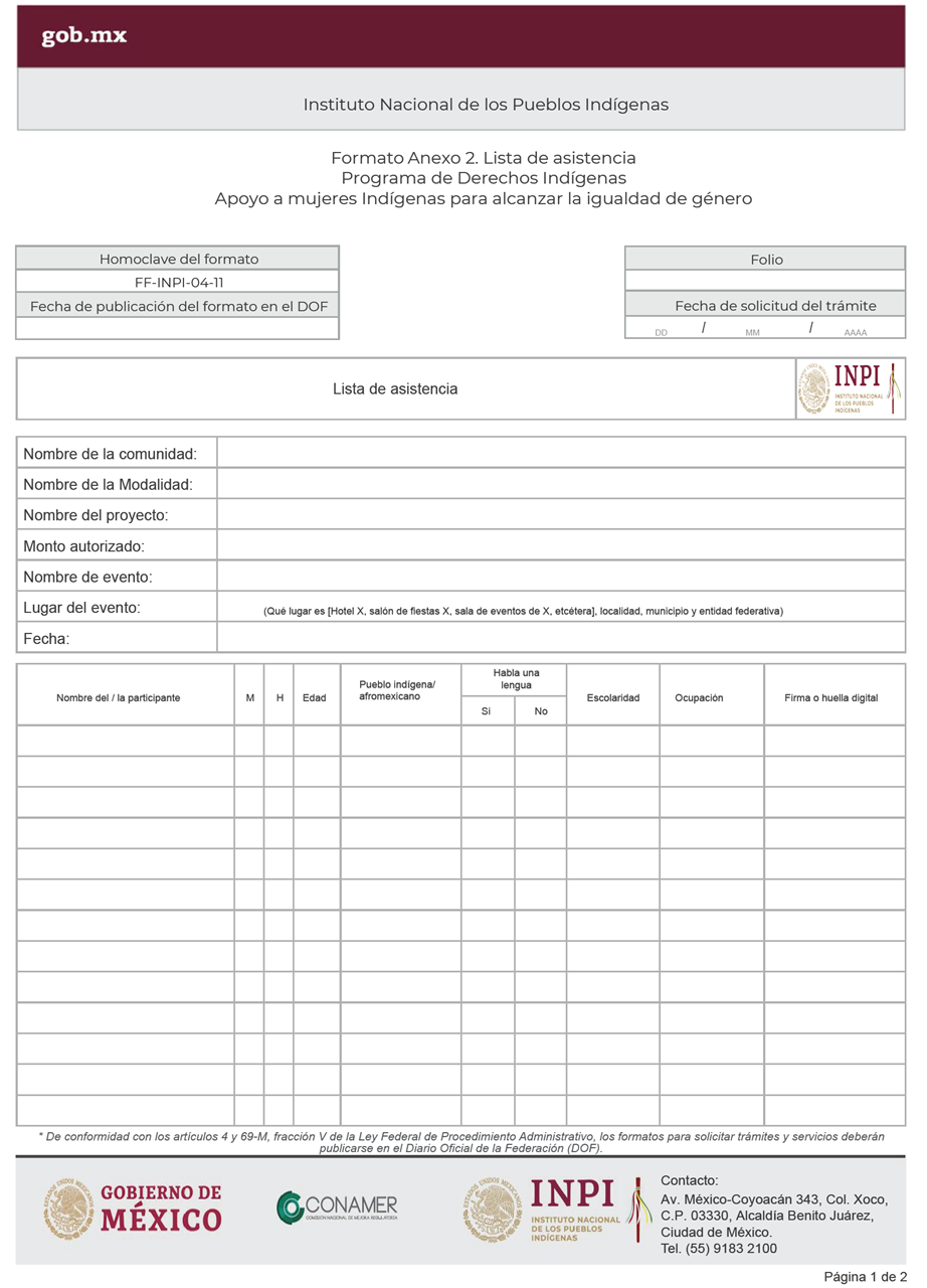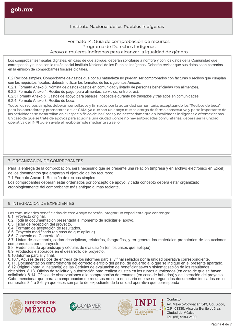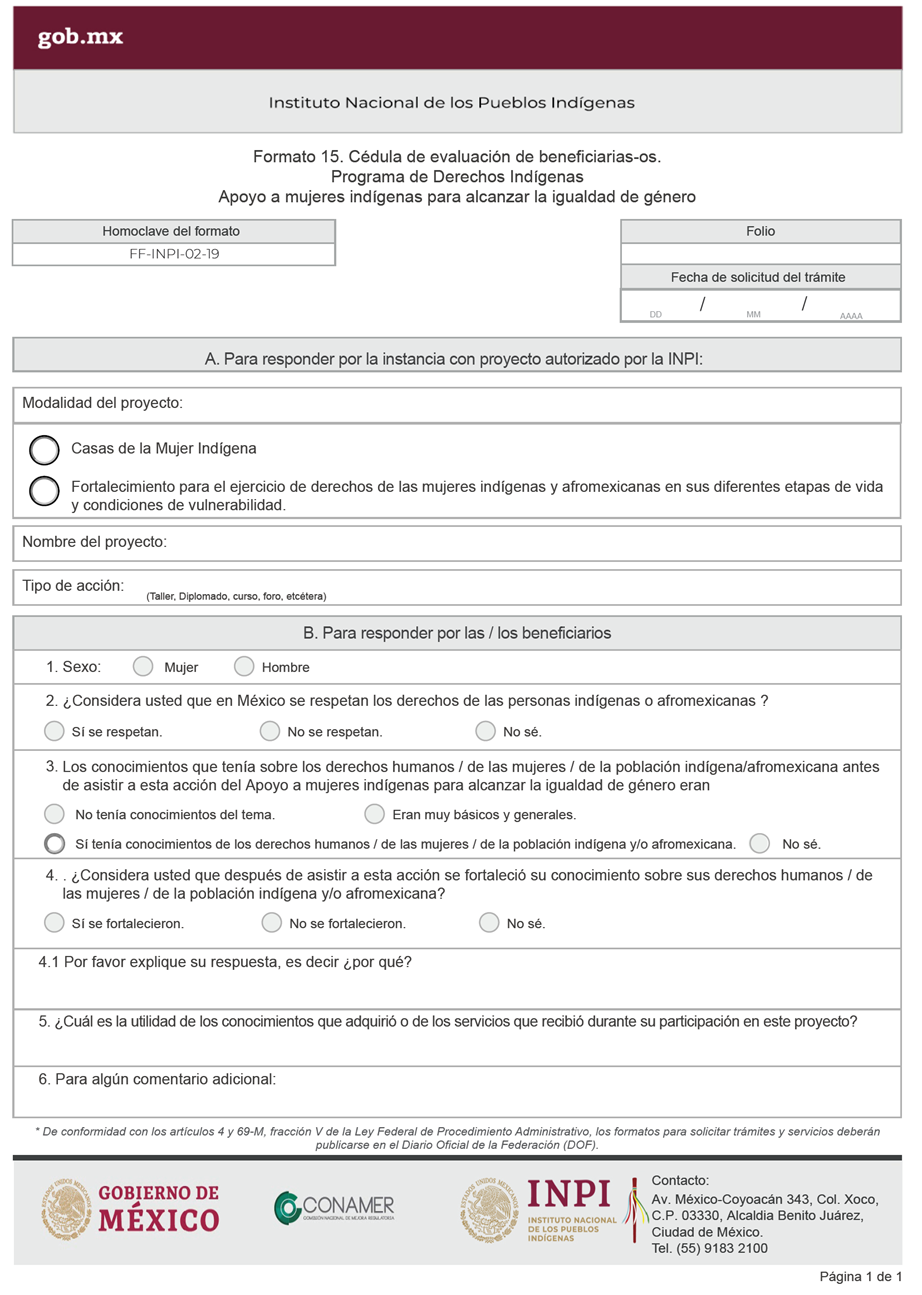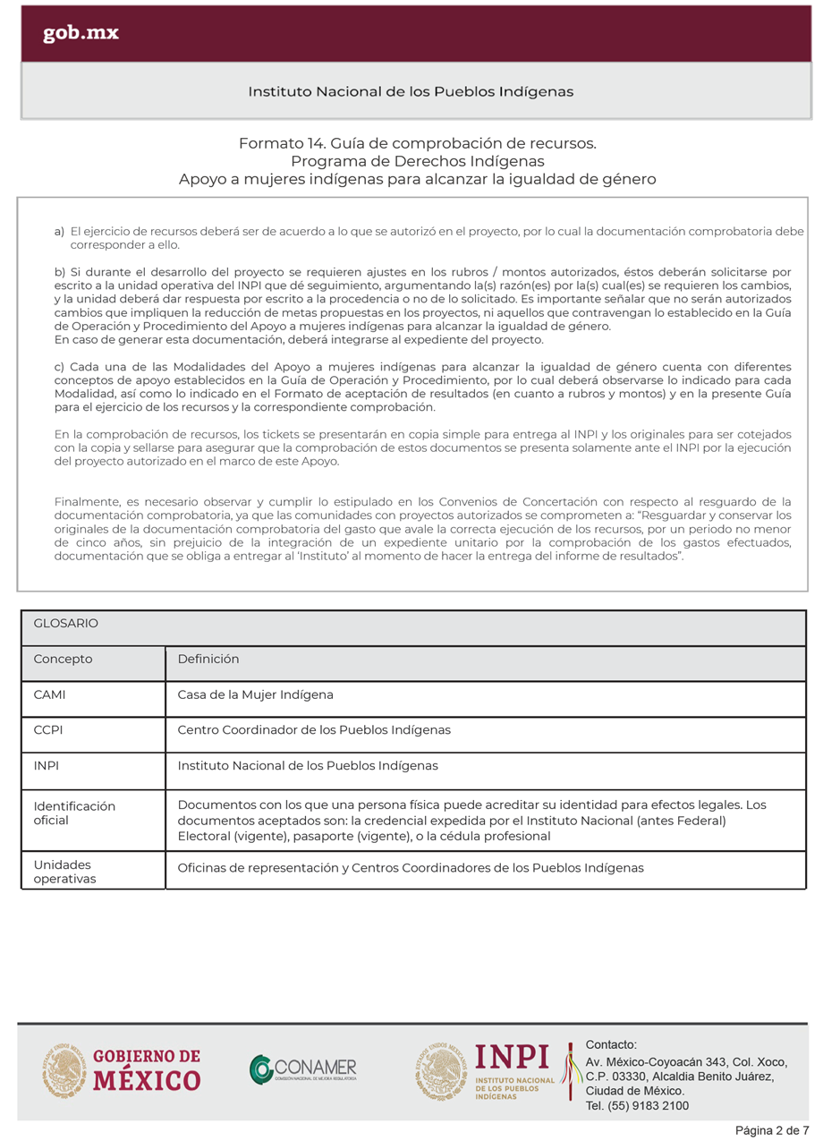 Simplificación administrativa del trámite Apoyos del Programa de Derechos Indígenas. Tipo de Apoyo Derecho a la Igualdad de Género, con modalidad Apoyo para apertura de una Casa de la Mujer Indígena (CAMI) con Homoclave (CDI-04-010-B) mediante la eliminación de los siguientes requisitos: Copia simple de la Cédula de Inscripción al RFC de la instancia solicitante. En este caso el documento solicitado es el acta que emite el Servicio de Administración Tributaria al momento en que asigna el Registro Federal de Contribuyentes. Quedan excluidas de este punto las CAMI de continuidad que no están constituidas legalmente, así como los grupos de trabajo que soliciten apertura de Casa; Las organizaciones constituidas en el ejercicio vigente deberán presentar copia de la Clave Única de Registro (CLUNI); Las organizaciones constituidas deberán adjuntar el acuse del informe ante INDESOL del ejercicio fiscal anterior; Documento expedido por el Servicio de Administración Tributaria (SAT), donde se haga constar que la instancia está al corriente con sus obligaciones fiscales. Aplica para las organizaciones que estén legalmente constituidas; Copia simple del acuse de recibo del informe final y comprobación de recursos del último año que haya ejecutado proyecto con financiamiento de la CDI, en caso que aplique; Copia simple del acta constitutiva protocolizada, así como copia de acta protocolizada que da vigencia a la representación legal de la organización; o copia del acta de la conformación del grupo de trabajo que presenta la solicitud; En el caso de adquisición de un bien inmueble, éste deberá tener un periodo de vida futura de al menos 30 años, que deberá comprobarse mediante dictamen de habitabilidad o dictamen técnico único expedido por autoridad competente. Para el caso de los grupos de trabajo, no aplica la compra del terrero o inmueble para la instalación de la CAMI; Registrar en el sistema informático, el nombre de dos propuestas de personas físicas o morales para realizar el acompañamiento especializado a la Casa de la Mujer Indígena durante el primer año de operación del proyecto. Se dará prioridad a las propuestas que consideren como asesora acompañante a mujeres indígenas; y Carta del Municipio y/o las autoridades tradicionales, según corresponda, de la cobertura en donde se pretende instalar la CAMI, mediante la cual se manifieste que las autoridades conocen el proyecto, el trabajo de la organización o grupo de mujeres y que están de acuerdo con la apertura de la Casa, dicha carta deberá estar firmada y sellada.