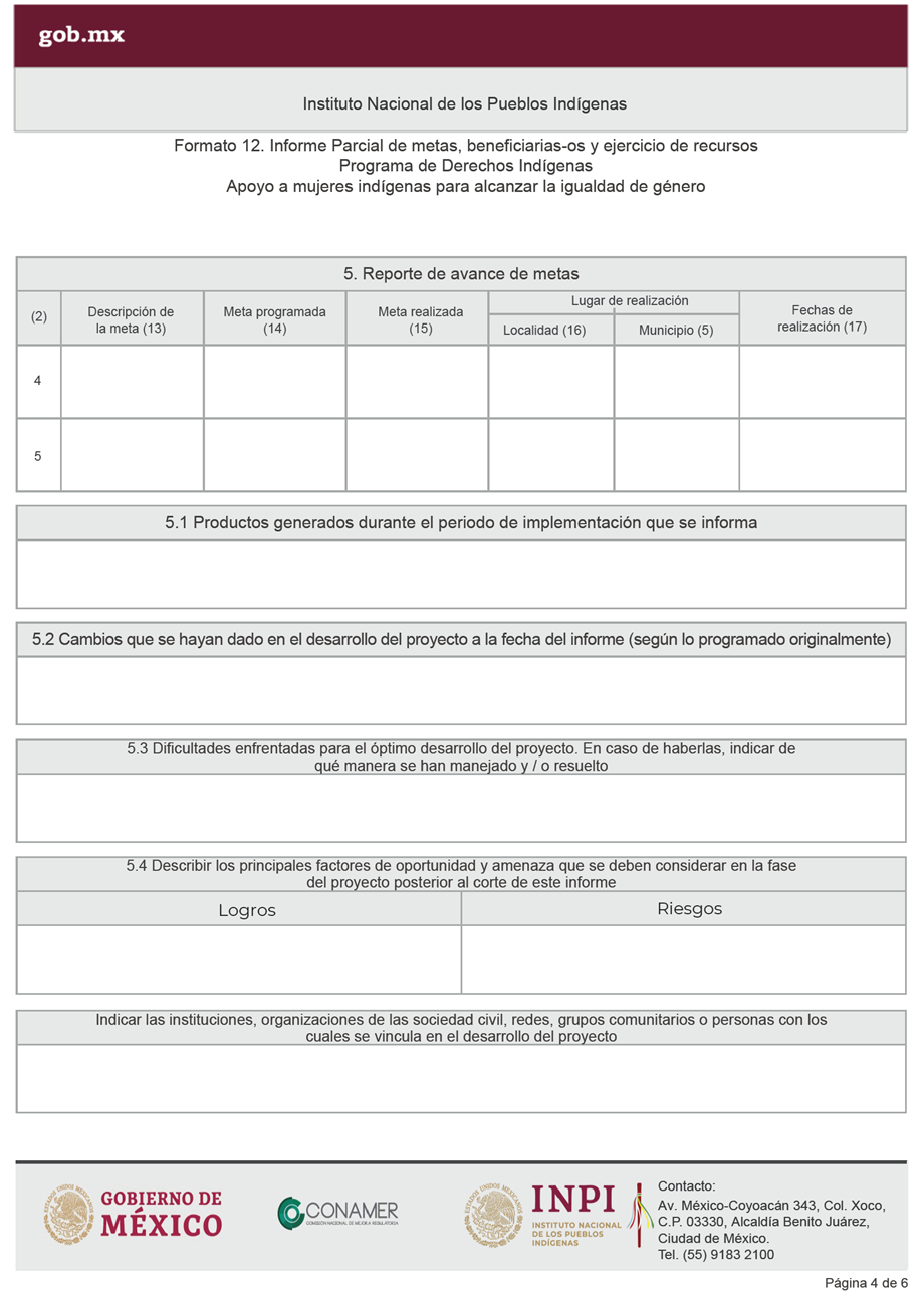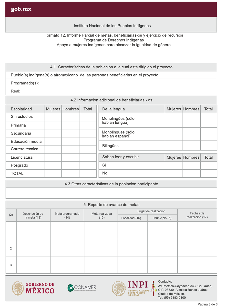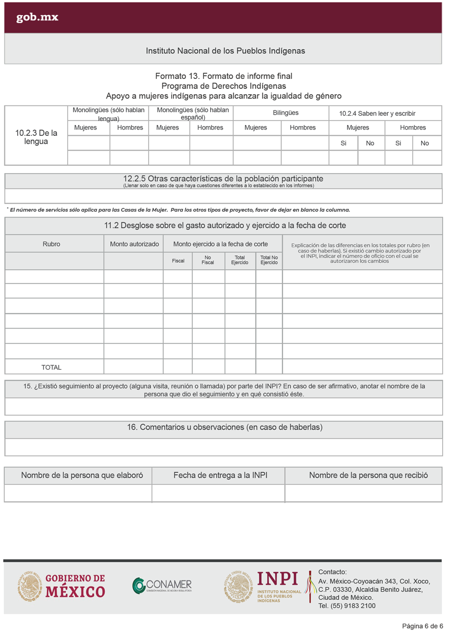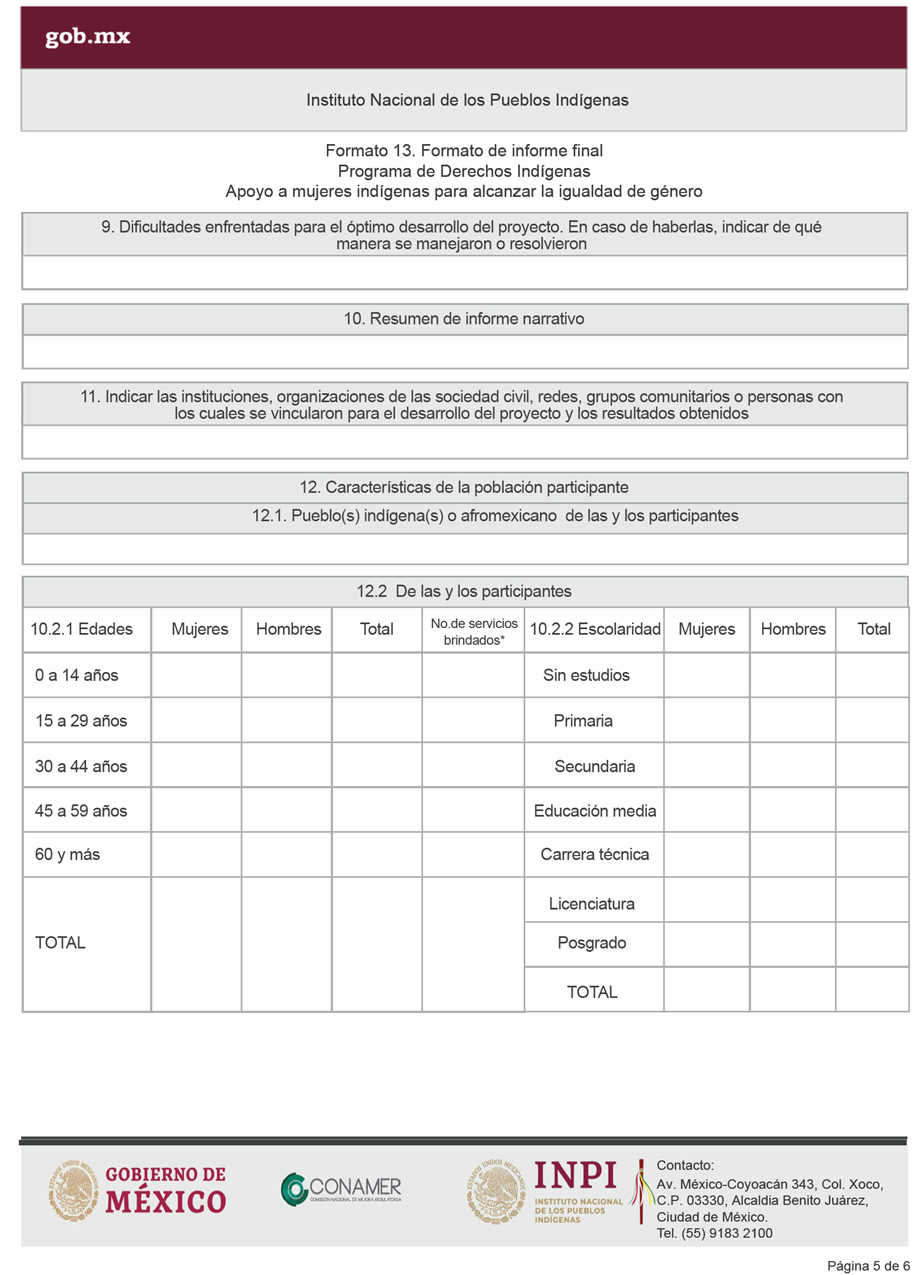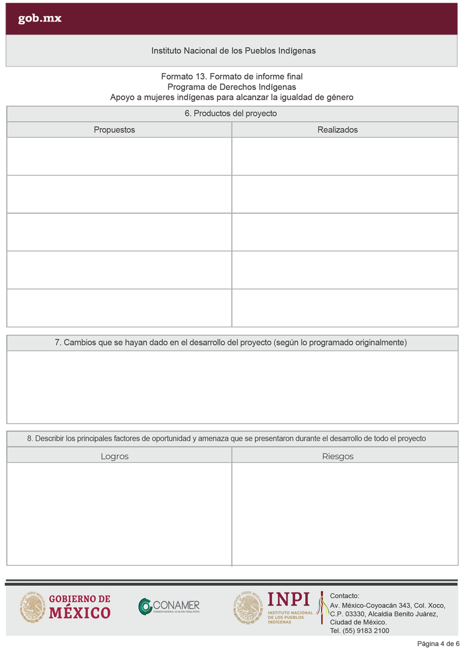 Simplificación administrativa del trámite Apoyos del Programa de Derechos Indígenas. Tipo de Apoyo Derecho a la Igualdad de Género, con modalidad Apoyo para apertura de una Casa de la Mujer Indígena (CAMI) con Homoclave (CDI-04-010-B) mediante la eliminación de los siguientes requisitos: Copia simple de la Cédula de Inscripción al RFC de la instancia solicitante. En este caso el documento solicitado es el acta que emite el Servicio de Administración Tributaria al momento en que asigna el Registro Federal de Contribuyentes. Quedan excluidas de este punto las CAMI de continuidad que no están constituidas legalmente, así como los grupos de trabajo que soliciten apertura de Casa; Las organizaciones constituidas en el ejercicio vigente deberán presentar copia de la Clave Única de Registro (CLUNI); Las organizaciones constituidas deberán adjuntar el acuse del informe ante INDESOL del ejercicio fiscal anterior; Documento expedido por el Servicio de Administración Tributaria (SAT), donde se haga constar que la instancia está al corriente con sus obligaciones fiscales. Aplica para las organizaciones que estén legalmente constituidas; Copia simple del acuse de recibo del informe final y comprobación de recursos del último año que haya ejecutado proyecto con financiamiento de la CDI, en caso que aplique; Copia simple del acta constitutiva protocolizada, así como copia de acta protocolizada que da vigencia a la representación legal de la organización; o copia del acta de la conformación del grupo de trabajo que presenta la solicitud; En el caso de adquisición de un bien inmueble, éste deberá tener un periodo de vida futura de al menos 30 años, que deberá comprobarse mediante dictamen de habitabilidad o dictamen técnico único expedido por autoridad competente. Para el caso de los grupos de trabajo, no aplica la compra del terrero o inmueble para la instalación de la CAMI; Registrar en el sistema informático, el nombre de dos propuestas de personas físicas o morales para realizar el acompañamiento especializado a la Casa de la Mujer Indígena durante el primer año de operación del proyecto. Se dará prioridad a las propuestas que consideren como asesora acompañante a mujeres indígenas; y Carta del Municipio y/o las autoridades tradicionales, según corresponda, de la cobertura en donde se pretende instalar la CAMI, mediante la cual se manifieste que las autoridades conocen el proyecto, el trabajo de la organización o grupo de mujeres y que están de acuerdo con la apertura de la Casa, dicha carta deberá estar firmada y sellada.