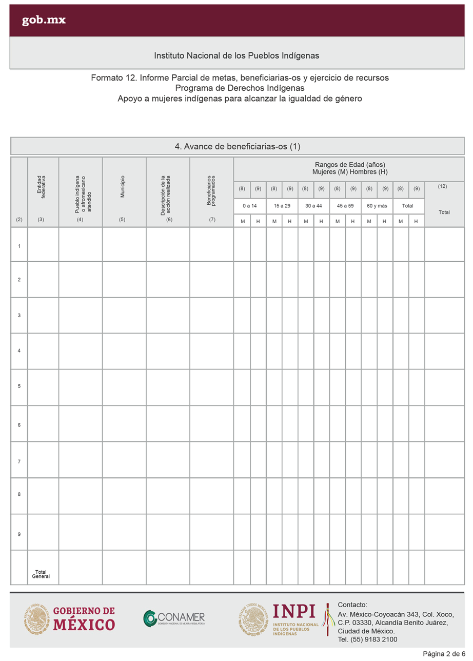| 1. Sensibilización en igualdad de género, 2. Derechos de las mujeres, 3. Prevención de la violencia familiar y de género, 4. Salud sexual y reproductiva, 4.1. Violencia obstétrica hacia mujeres indígenas y/o afromexicanas, 4.2. Prevención de embarazos en adolescentes, 4.3. Contribución a la erradicación del embarazo en niñas y adolescentes de 10 a 14 años, 4.4. Prevención del VIH, 4.5. Partería tradicional, 5. Masculinidades con enfoque intercultural, 6. Capacitación de formadoras con perspectiva de género, 7. Derechos de las mujeres indígenas y/o afromexicanas con discapacidad, 8. Acciones para la sensibilización sobre las consecuencias del matrimonio infantil en niñas y niños indígenas y/o afromexicanas, 9. Derechos político-electorales de las mujeres indígenas y afromexicanas, y 10. Derechos agrarios y acceso a la tierra. | A. Autoridades municipales, estatales o federales, B. Población indígena y/o afromexicana en zonas urbanas, C. Jornaleras, D. Madres y padres de familia, E. Niñas, niños y/o adolescentes, F. Parteras tradicionales, y G. Trabajadoras domésticas.
