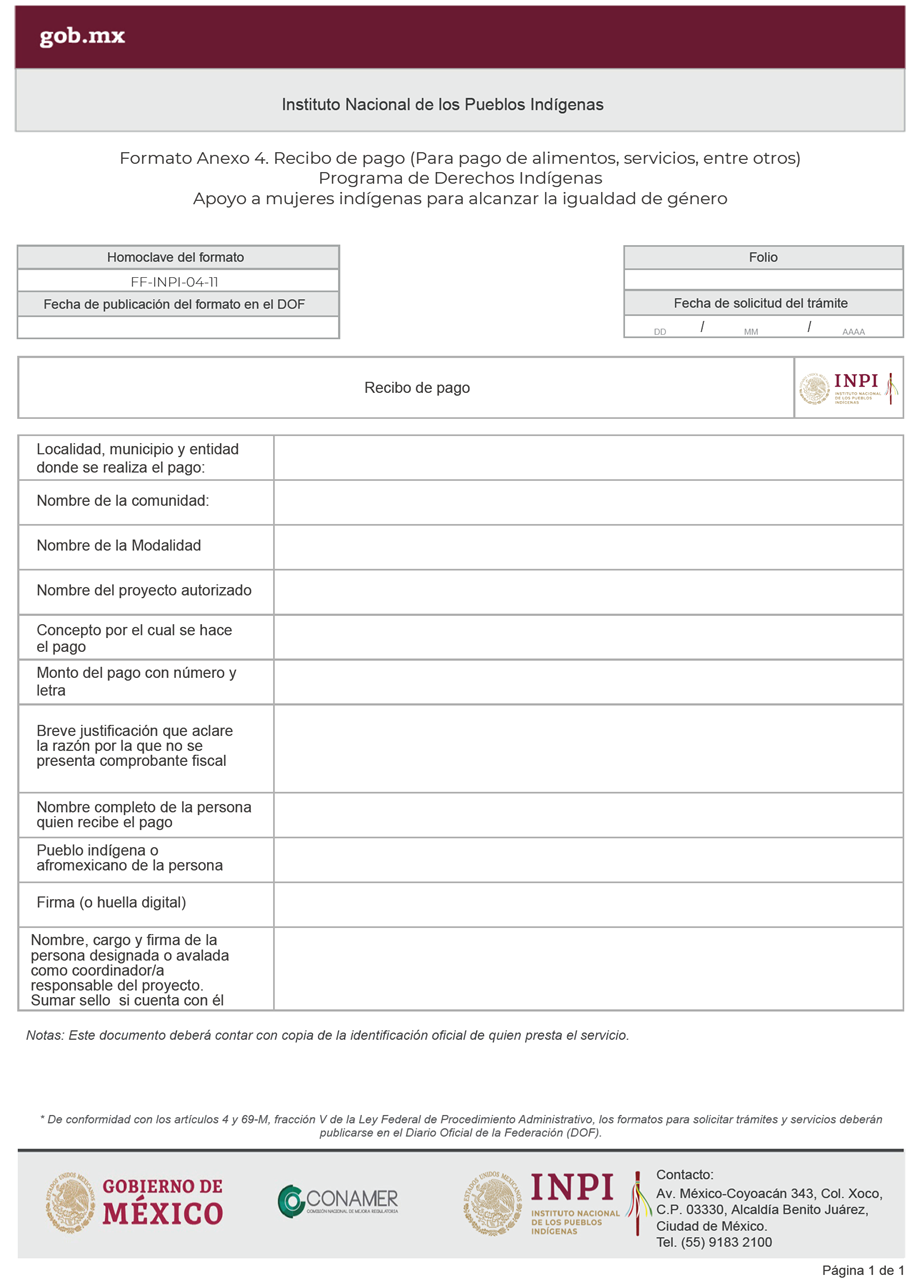 Simplificación administrativa del trámite Apoyos del Programa de Derechos Indígenas. Tipo de Apoyo Derecho a la Igualdad de Género, con modalidad Apoyo para Casas de la Mujer Indígena de continuidad con Homoclave (CDI-04-010-A) mediante la eliminación de los siguientes requisitos: Copia simple de la Clave Única de Registro de Población (CURP) de la representante de la instancia solicitante; Copia simple de la Cédula de Inscripción al RFC de la instancia solicitante. En este caso el documento solicitado es el acta que emite el Servicio de Administración Tributaria al momento en que asigna el Registro Federal de Contribuyentes. Quedan excluidas de este punto las CAMI de continuidad que no están constituidas legalmente, así como los grupos de trabajo que soliciten apertura de Casa; Las organizaciones constituidas en el ejercicio vigente deberán presentar copia de la Clave Única de Registro (CLUNI); Las organizaciones constituidas deberán adjuntar el acuse del informe ante INDESOL del ejercicio fiscal anterior; Documento expedido por el Servicio de Administración Tributaria (SAT), donde se haga constar que la instancia está al corriente con sus obligaciones fiscales. Aplica para las organizaciones que estén legalmente constituidas; Copia simple del acuse de recibo del informe final y comprobación de recursos del último año que haya ejecutado proyecto con financiamiento de la CDI, en caso que aplique; y Copia simple del acta constitutiva protocolizada, así como copia de acta protocolizada que da vigencia a la representación legal de la organización; o copia del acta de la conformación del grupo de trabajo que presenta la solicitud.