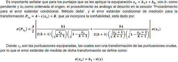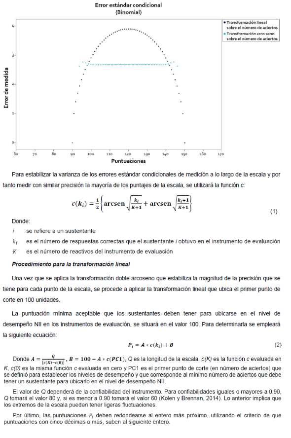 El dato obtenido del error estándar condicional deberá reportarse en la misma escala en que se comunican las calificaciones de los sustentantes e incorporarse en el informe o manual técnico del instrumento (estándar 2.13 de los Estándares para las Pruebas Educativas y Psicológicas de la American Educational Research Association et. al., 2014). Asimismo, esto permite atender al estándar 2.14 de los Estándares para las Pruebas Educativas y Psicológicas de la American Educational Research Association et. al., 2014, el cual establece que cuando se especifican puntos de corte para selección o clasificación, los errores estándar deben ser reportados en la vecindad de cada punto de corte en dicho informe o manual técnico.