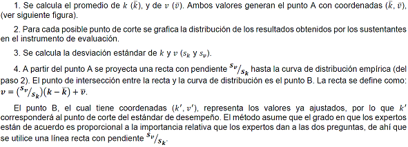 Posteriormente, se le solicita a cada juez que estime la probabilidad mínima de que un sustentante conteste correctamente un reactivo, el que le sigue y así hasta concluir con la totalidad de los reactivos, posteriormente se calcula el puntaje esperado (raw score: la suma de estas probabilidades multiplicadas por uno para el caso de reactivos -toda vez que cada reactivo vale un punto-; o bien, la suma de estas probabilidades multiplicadas por el valor máximo posible de las categorías de la rúbrica). Las decisiones de los jueces se promedian obteniendo el punto de corte. La decisión del conjunto de jueces pasa por una primera ronda para valorar sus puntos de vista en plenaria y puede modificarse la decisión hasta llegar a un acuerdo en común.