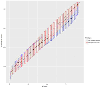 Cuando se aplica la transformación doble arcoseno sobre el número de aciertos obtenido en el instrumento de evaluación, el error estándar condicional de medición de las puntuaciones obtenidas se estabiliza, es decir, es muy similar, pero no igual, a lo largo de la distribución de dichas puntuaciones, con excepción de los valores extremos, a diferencia de si se aplica una transformación lineal, tal y como se observa en la siguiente gráfica (Won-Chan, Brennan y Kolen, 2000).