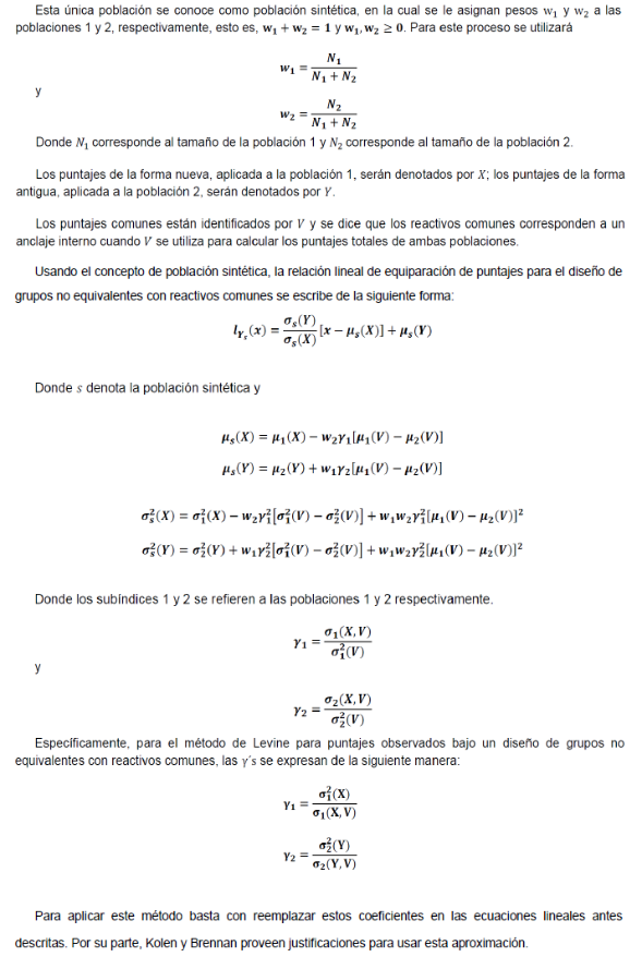 La equiparación de las formas de un instrumento deberá realizarse utilizando el método de equiparación lineal de Levine (Kolen y Brennan, 2014), para puntajes observados bajo un diseño de grupos no equivalentes con reactivos comunes. Dicho diseño es uno de los más utilizados en la práctica. En cada muestra de sujetos se administra solamente una forma de la prueba, con la peculiaridad de que en ambas muestras se administra un conjunto de reactivos en común llamado ancla, que permite establecer la equivalencia entre las formas a equiparar.