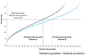El escalamiento (Wilson, 2005) se llevará a cabo a partir de las puntuaciones crudas de los sustentantes, y se obtendrá una métrica común para los instrumentos de evaluación, que va de 60 a 170 puntos, aproximadamente, ubicando el primer punto de corte (nivel de desempeño NII) para los instrumentos en los 100 puntos. El escalamiento consta de dos transformaciones: