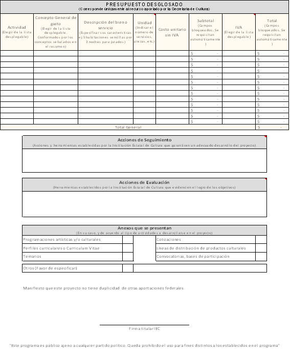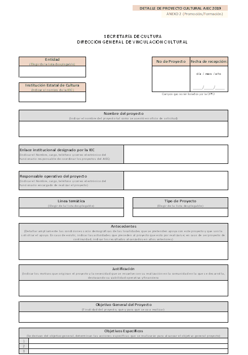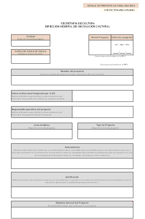 a) Entregar por cada uno de los proyectos a la Dirección General de Vinculación Cultural el formato denominado "Detalle del Proyecto Cultural" con la siguiente información: Entidad; institución estatal de cultura; nombre del proyecto; enlace institucional designado por la IEC; responsable operativo del proyecto; línea temática; tipo de proyecto; antecedentes; justificación; objetivos general y específicos; periodo de realización; metas; descripción; cronograma ; población objetivo; número estimado de personas a atender de manera directa; beneficio social del proyecto; resumen presupuestal; presupuesto desglosado; acciones de seguimiento y acciones de evaluación los cuales obrarán bajo la custodia de dicha Unidad Administrativa.