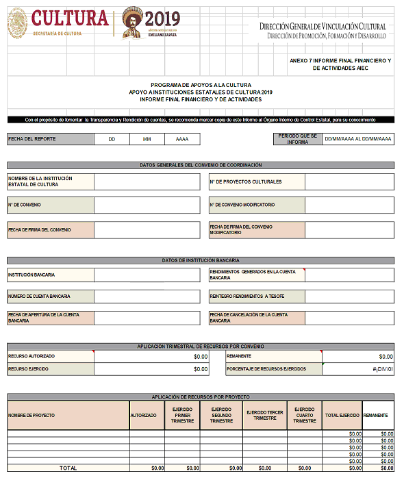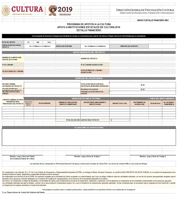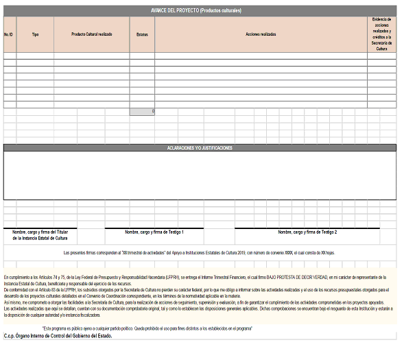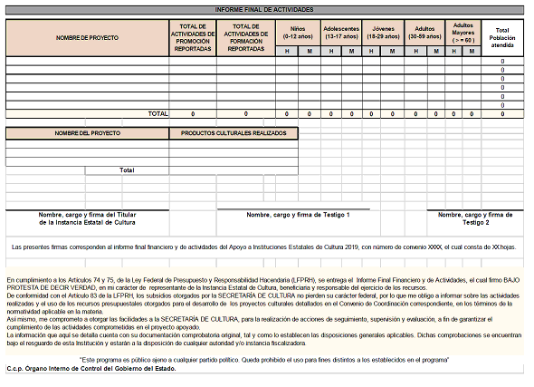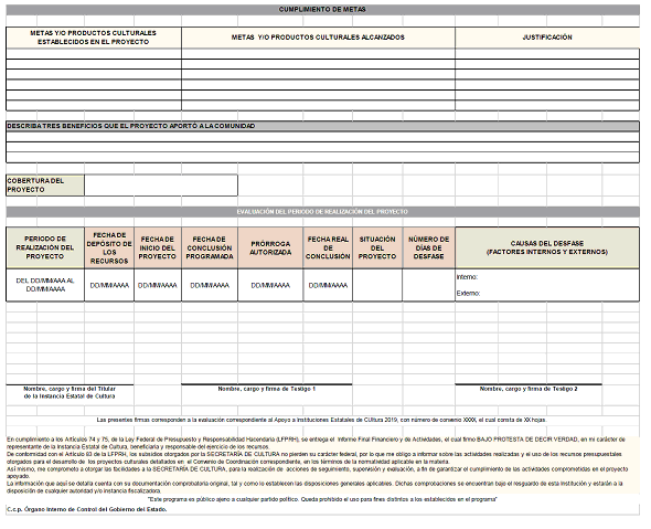 SÉPTIMA. RENDICIÓN DE CUENTAS. Además de las obligaciones mencionadas en la cláusula anterior, "LA INSTITUCIÓN ESTATAL DE CULTURA", deberá entregar a "LA SECRETARÍA" un informe final con la información de cada uno de los proyectos culturales realizados, mismo que deberá de entregarse a más tardar 15 días hábiles posteriores a su conclusión. Dicho informe se presentará bajo protesta de decir verdad, con la firma autógrafa del titular de "LA INSTITUCIÓN ESTATAL DE CULTURA" y de dos testigos, preferentemente, el responsable del proyecto y el responsable del área administrativa de "LA INSTITUCIÓN ESTATAL DE CULTURA". El informe deberá describir las actividades realizadas y las erogaciones correspondientes, en los formatos que para ello establezca "LA SECRETARÍA", con el fin de observar su correcta aplicación.
