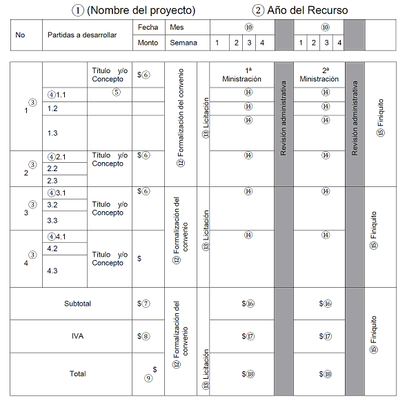 22. Fecha de conclusión programada: Anotar la fecha de conclusión prevista en el proyecto autorizada utilizando números: dos dígitos para el día y el mes y cuatro para el año.