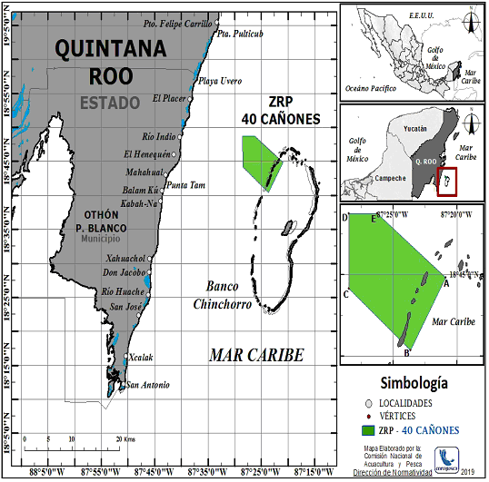 Figura: Delimitación y descripción de la Zona de Refugio Pesquero Total Temporal, en aguas de jurisdicción federal en el área de "Banco Chinchorro", en el Municipio de Othón P. Blanco, en el Estado de Quintana Roo (El plano de ubicación contenido en el presente Acuerdo es con fines específicamente de referencia geográfica y sin valor cartográfico).
