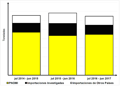 b. Las importaciones investigadas se incrementaron en términos absolutos y relativos. Durante el periodo analizado registraron un crecimiento de 3% y aumentaron su participación en el CNA y el consumo interno en 1 punto porcentual, al pasar de una contribución de 15% en el periodo julio de 2014-junio de 2015 a 16% en el periodo investigado, en ambos indicadores. En relación con el volumen de la PNOMI, representaron 21% y 23% en los mismos periodos, respectivamente. En razón de ello, las importaciones investigadas desplazaron a las ventas internas de la rama de producción nacional, especialmente en el periodo previo al investigado.
