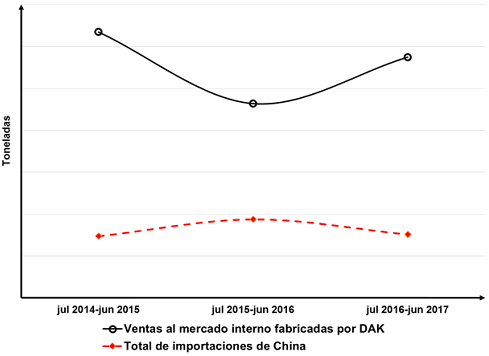 433. Por otra parte, respecto a las importaciones realizadas por DAK, considerando a los clientes identificados como aquellos a los que DAK vende la mercancía que importa, la Secretaría observó que si bien las compras que realizan dichos clientes a DAK, tanto de mercancía nacional como de mercancía importada, disminuyeron en el periodo analizado, las primeras lo hicieron en mayor medida, disminuyendo su participación en las compras acumuladas tanto de mercancía nacional como de mercancía importada al pasar de representar 90% en el periodo julio de 2014-junio de 2015 a 87% en el periodo investigado. En este sentido, la disminución de las ventas internas de la rama de producción nacional en el periodo analizado, se atribuye principalmente a las importaciones investigadas, ya que incrementaron su contribución en las ventas internas al pasar de una participación de 20% en el periodo julio de 2014-junio de 2015 a 23% en el periodo investigado.