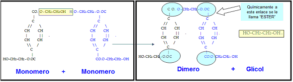 9. El PFC es un polímero cuyo nombre proviene de "poli" que significa muchos, y "éster", un compuesto orgánico derivado del petróleo. Los insumos principales utilizados en su fabricación son el PTA y el MEG, cuya reacción resulta en la estructura química de poliéster; tal como se observa en la siguiente ilustración.