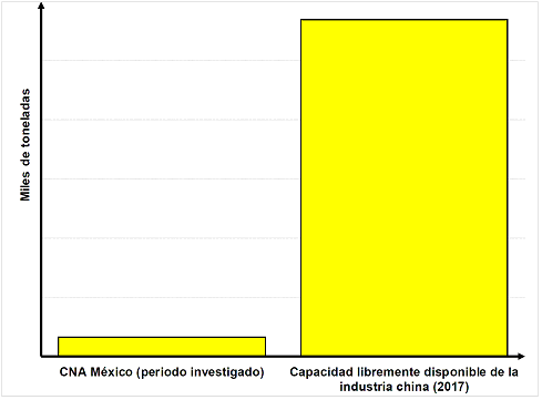 d. con base en las cifras de capacidad instalada, producción y consumo interno presentadas por la CCCT, la industria de China fabricante de PFC, si bien presentó ligeras disminuciones de capacidad instalada y capacidad libremente disponible de 2014 a 2017, mantuvo niveles crecientes de producción, además de que dichos indicadores representan más de sesenta veces el mercado mexicano, así como la producción y la capacidad instalada de la rama de producción nacional de PFC. En este sentido, la Secretaría observó que: i) la capacidad instalada china de PFC en 2017 representó en el periodo investigado, casi más de cien veces el tamaño de la capacidad instalada de la industria mexicana fabricante de PFC, y más de 95 veces el mercado mexicano de PFC; ii) la producción de la industria china fabricante de PFC en 2017 representó más de 75 veces el tamaño del mercado nacional y más de 85 veces el tamaño de la producción nacional de PFC, ambas en el periodo investigado, y ii) la capacidad libremente disponible de las industria china de PFC de 2017 representó casi 20 veces el tamaño del mercado mexicano en el periodo investigado. Tal como se observa en la siguiente gráfica.