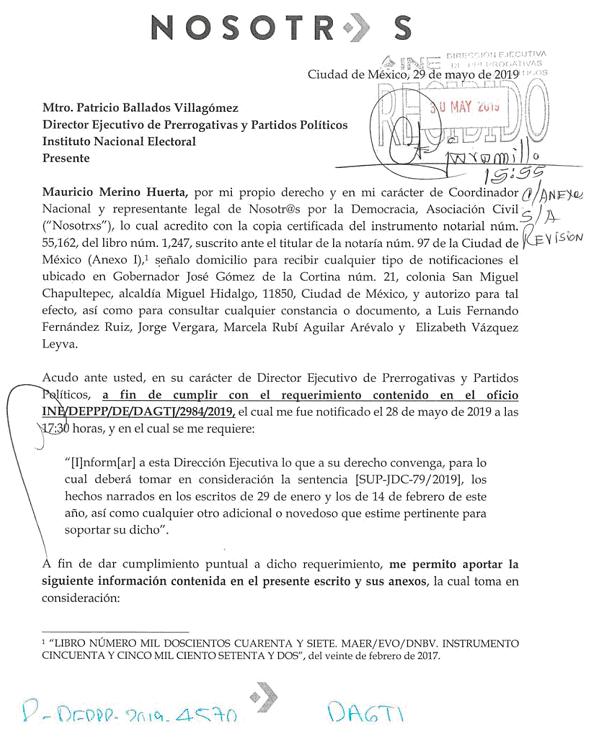 X. El 30 de mayo de 2019, Mauricio Merino Huerta, por su propio derecho y en su carácter de Coordinador Nacional y representante legal de la asociación civil "Nosotr@s por la Democracia", respondió el requerimiento citado en el antecedente anterior.