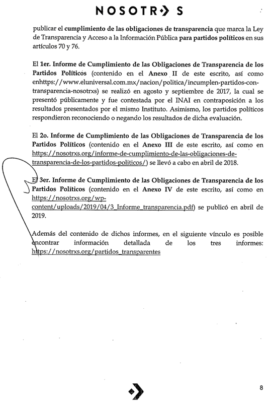 El 3er. Informe de Cumplimiento de las Obligaciones de Transparencia de los Partidos Políticos (contenido en el Anexo IV de este escrito, así como en https: //nosotrxs.org/ wp-content/uploads/2019 /04/3_Informe_ transparencia.pdf) se publicó en abril de 2019.