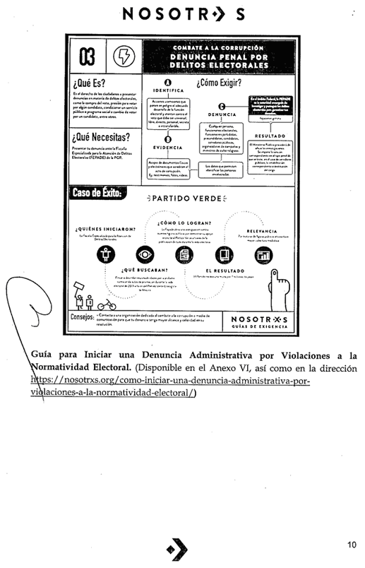 Además de lo anterior, la asociación civil remite con el escrito dos guías que contienen los pasos a seguir ante la existencia de un delito electoral, así como violaciones a la normatividad electoral, las cuales este Consejo General del INE ha constado su existencia en las siguientes ligas: https://nosotrxs.org/ como-hacer-una-denuncia-penal-por-delito-electoral/ y https://nosotrxs.org/como-iniciar-una-denuncia-administrativa-por-violaciones-a-la-normatividad-electoral/