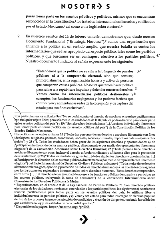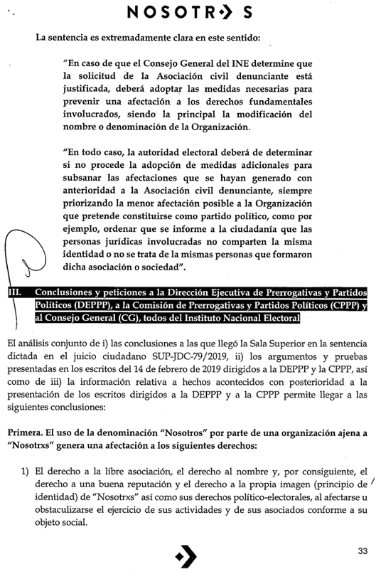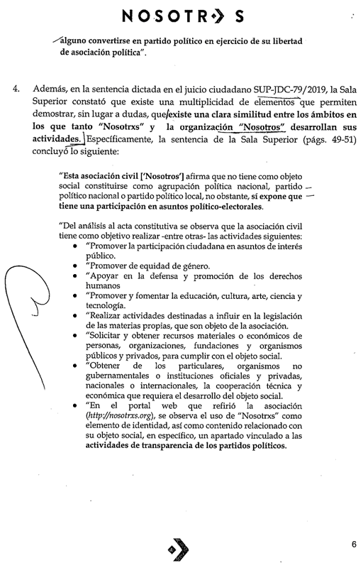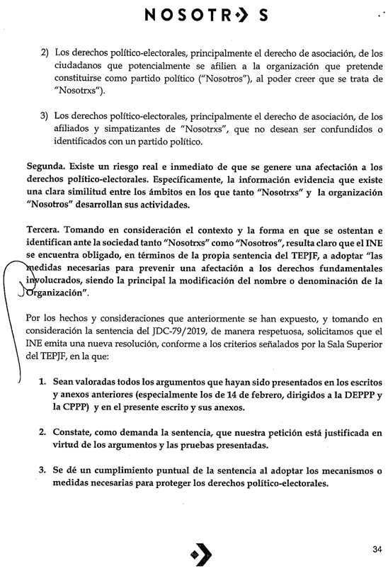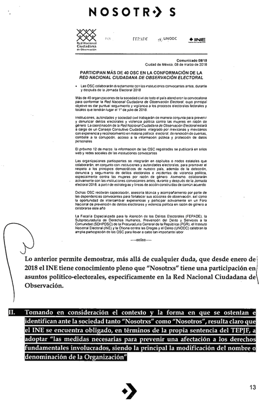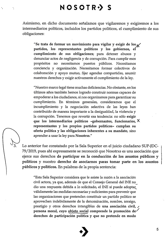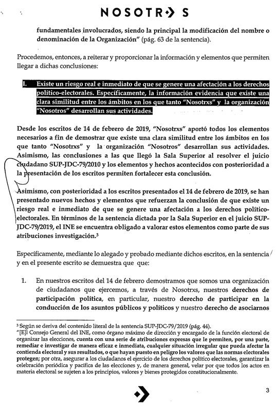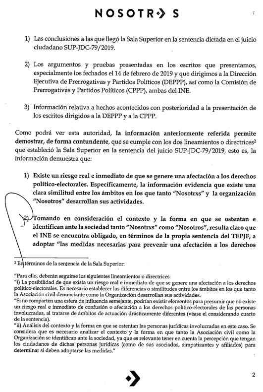 Con la respuesta, "Nosotrxs" reiteró como principales argumentos lo confirmado por la Sala Superior del TEPJF en la sentencia que se acata: i. Similitud entre los ámbitos en los que tanto "Nosotrxs" y la organización "Nosotros" desarrollan sus actividades (afectación a los derechos de participación política, en particular, derecho de participar en la conducción de los asuntos públicos y