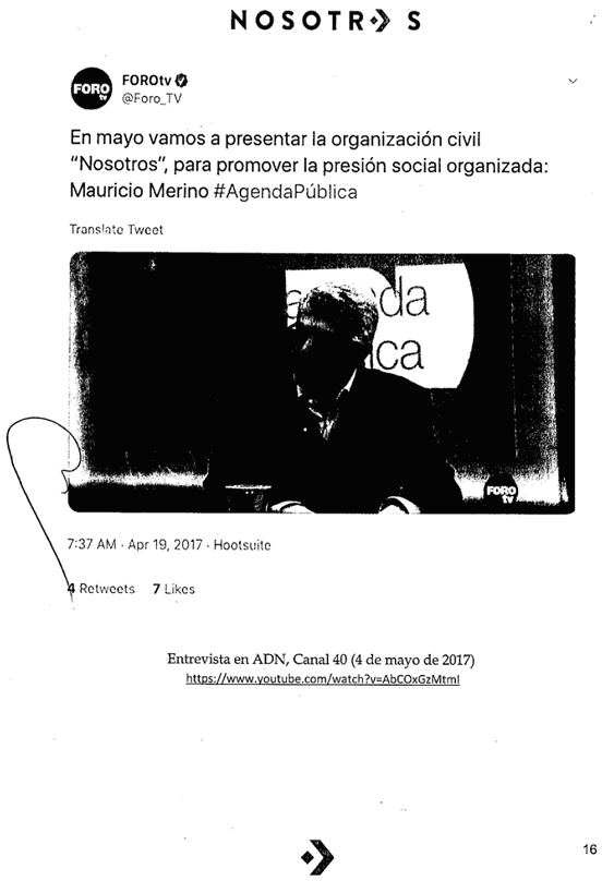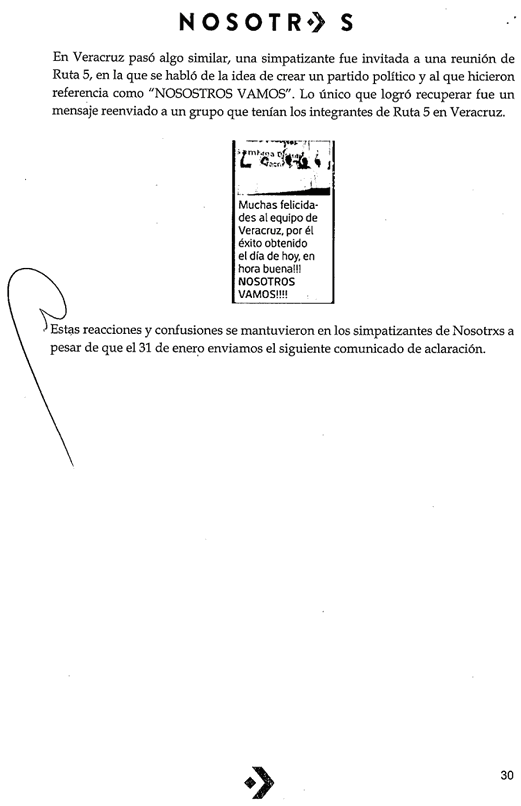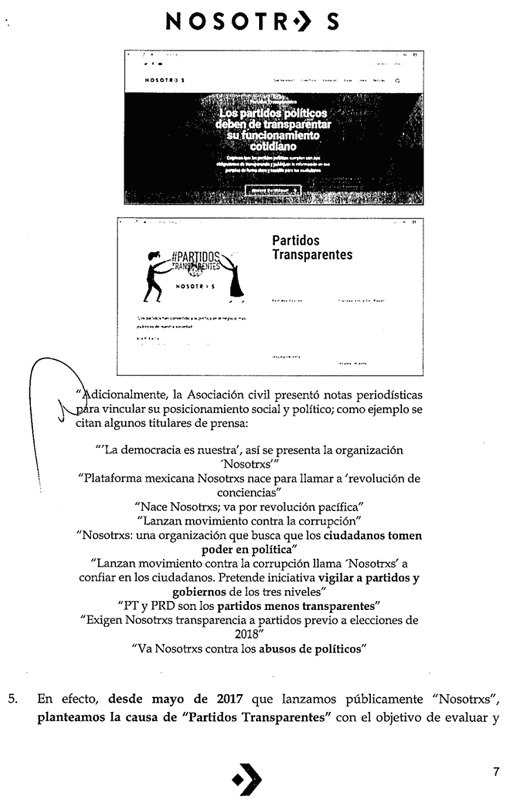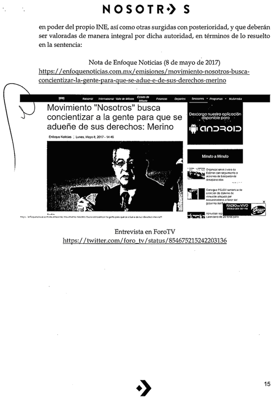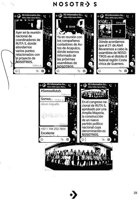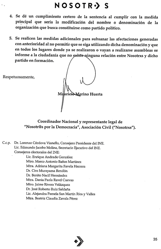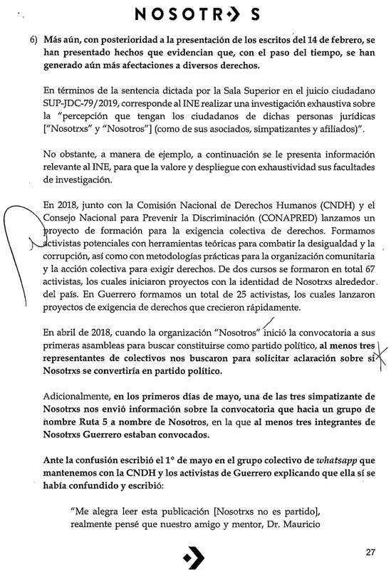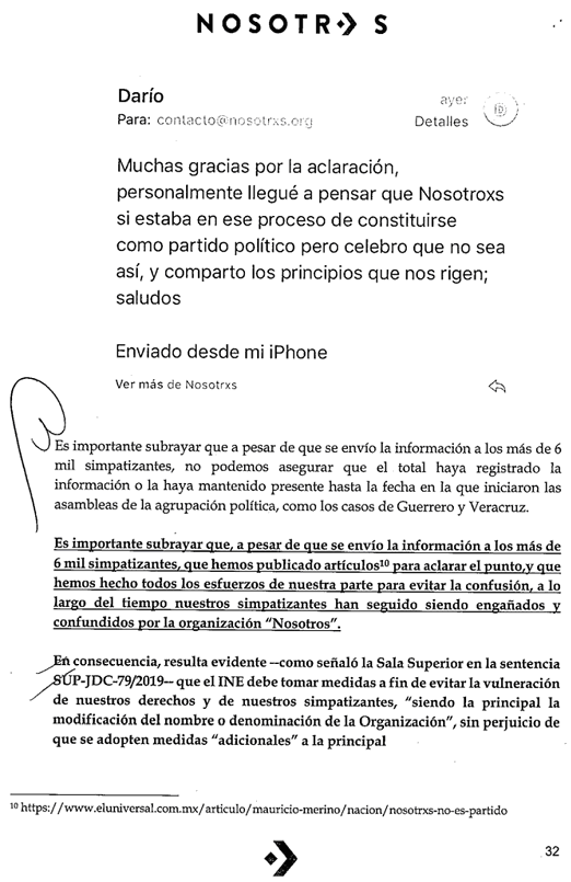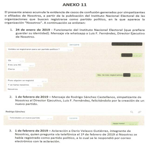 Además de lo antes señalado, la asociación civil manifiesta conforme al Anexo 11 o Anexo XV de los escritos de catorce de febrero y 30 de mayo de este año, recibieron diversos mensajes, por parte de simpatizantes y afiliados, cuestionado si Nosotrxs tiene alguna relación la organización Nosotros.