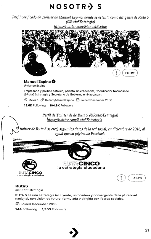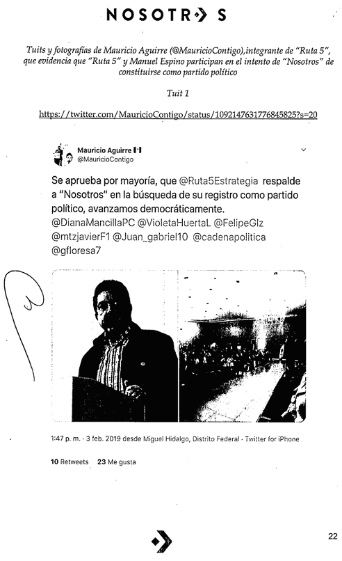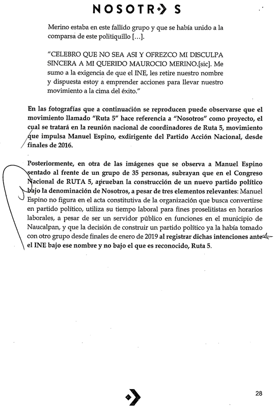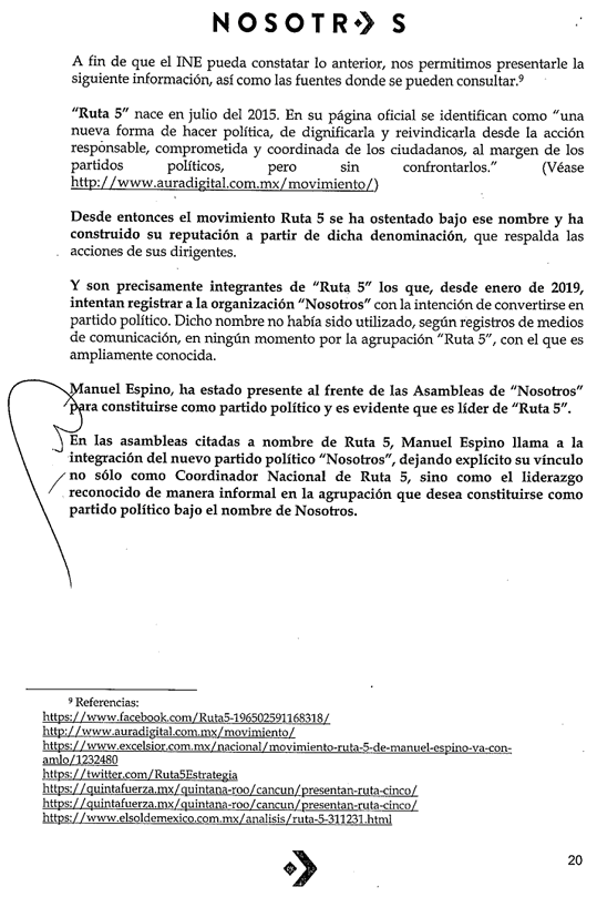 "El riesgo riesgo (sic) real e inmediato de que se genere una afectación a diversos derechos, es aún más evidente si se considera que la organización "Nosotros"; nunca había utilizado esa denominación. La información que a continuación presentamos --y que el INE debe valorar en virtud de los resuelto en el SUP-JDC-79/2019-- muestra que la organización "Nosotros" previamente se había ostentado e identificado como "Ruta 5".