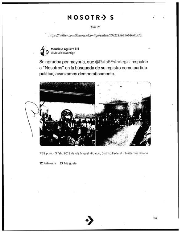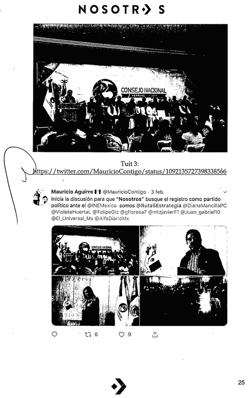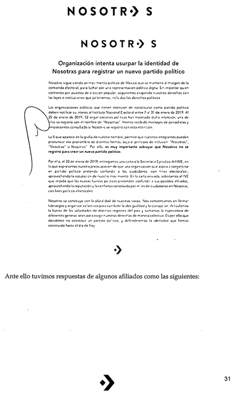 Por lo que respecta al comunicado referido en la foja 31 del escrito de la Asociación Civil Nosotr@s por la Democracia fechado el 1 de febrero de 2019, así como el artículo titulado "Nosotrxs no es partido" de 29 de abril del presente año, este Consejo General del INE ha constatado su existencia en las siguientes ligas https://nosotrxs.org/organizacion-intenta-usurpar-la-identidad-de-nosotrxs-para-registrar-un-nuevo-partido-politico/ y https://www.eluniversal.com.mx/articulo/mauricio-merino/nacion/nosotrxs-no-es-partido