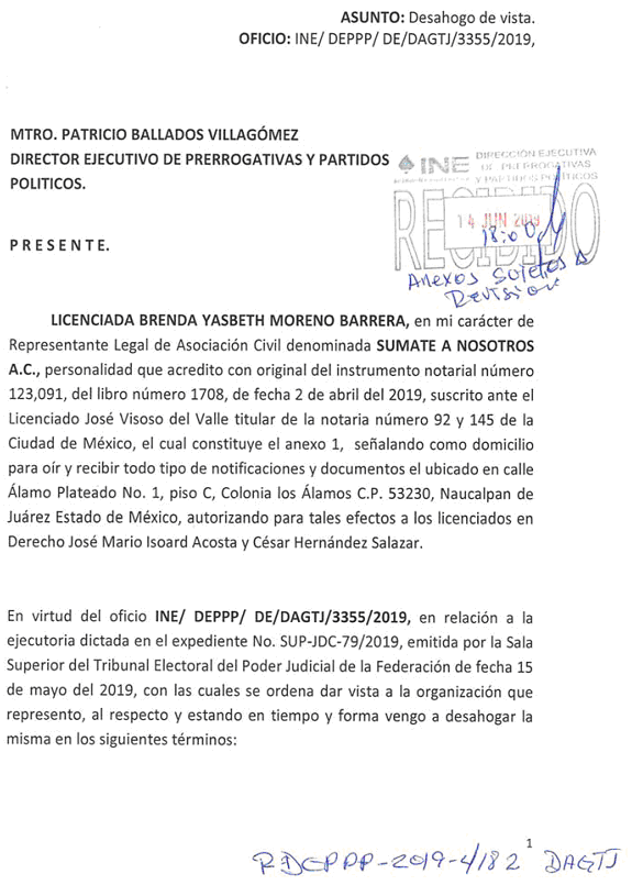 XII. El 14 de junio de 2019, la representante legal de la asociación civil "Súmate a Nosotros" respondió al requerimiento citado en el antecedente anterior.