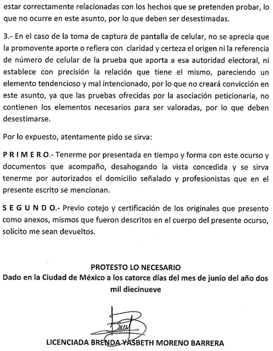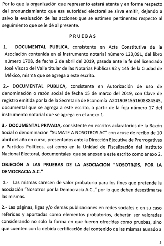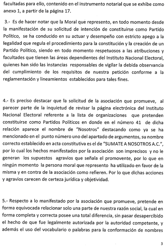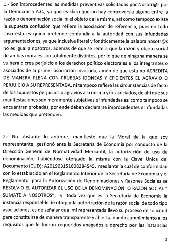 "...1.- Son improcedentes las medidas preventivas solicitadas por Nosotr@s por la Democracia A.C., ya que es claro que no hay controversia alguna entre la razón o denominación social ni el objeto de la misma, así como tampoco existe la supuesta confusión que refiere la asociación de referencia, pues en todo caso ésta es quien pretende confundir a la autoridad con sus infundadas argumentaciones, ya que inclusive literal y fonéticamente la palabra nosotr@s no es igual a nosotros, además de que se reitera que la razón y objeto social de ambas morales son totalmente distintos, por lo que de ninguna manera se vulnera o crea perjuicio a los derechos político electorales a los integrantes o asociados de la primer asociación invocada, amén de que esta no ACREDITA DE MANERA PLENA CON PRUEBAS IDONEAS Y EFICIENTES EL AGRAVIO O PERJUICIO A SU REPRESENTADA, ni tampoco refiere las circunstancias de facto de los supuestos perjuicios o agravios a la misma y/o asociados, de ahí que sus manifestaciones son meramente subjetivas e infundadas así como tampoco se encuentran probadas, por ende deben declararse improcedentes e infundadas las medidas que pretenden...".