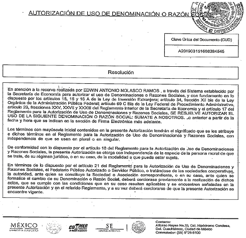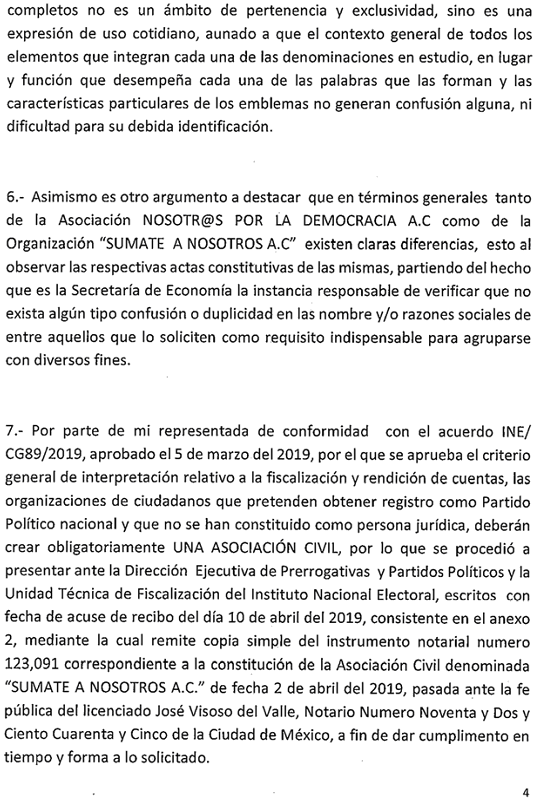 B) Por lo que respecta a la organización "Súmate a Nosotros" que busca su registro como PPN, resulta necesario estar a lo señalado por la representante legal en el escrito de notificación de carta de intención para constituir un PPN de 23 de enero de 2019, en el que señala "comparezco respetuosamente a manifestar la intención de nuestra organización de ciudadanos "NOSOTROS", de constituirnos como Partido Político Nacional durante el proceso de registro 2019-2020" y también señala que "el grupo de ciudadanos que represento para efecto de cumplir con los requisitos (...) formó una organización de ciudadanos con fecha 19 de enero de 2019, bajo la denominación "NOSOTROS".