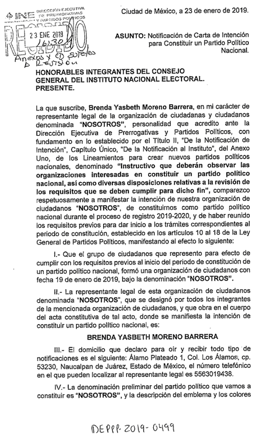 I. El 23 de enero de 2019, la organización "Nosotros" notificó al Instituto Nacional Electoral, la solicitud de intención de constituirse como Partido Político Nacional, bajo el nombre preliminar "Nosotros".