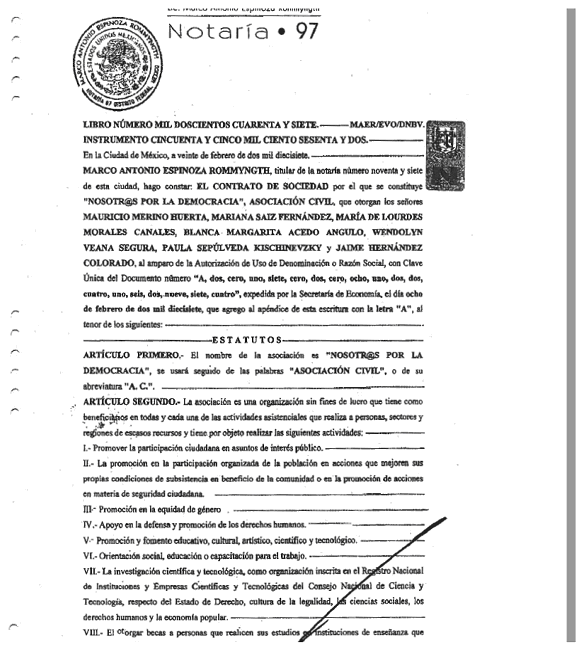 A) "Nosotr@s por la Democracia, A.C." conforme a su acta constitutiva y al contenido de su sitio web es una asociación civil asumida como un movimiento que busca reconstruir la democracia desde la ciudadanía, que hace valer la ley para fortalecer el ejercicio de derechos y promueve la exigencia de legalidad en todo el país.