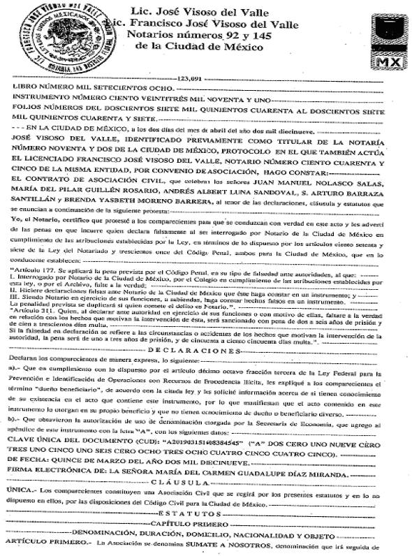 También es oportuno señalar que conforme al testimonio de constitución de "Súmate a Nosotros", la asociación civil de forma genérica contribuirá al desarrollo político, económico, social y cultural en México, en condiciones de libertad, paz, igual y respeto a la autonomía y derechos de las personas y en apego estricto a la Constitución y de las Leyes que de ella emanen. Lo que a todas luces es acorde con lo establecido en los artículos 41 de la CPEUM y 3 de la LGPP.