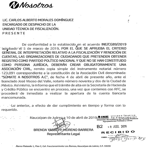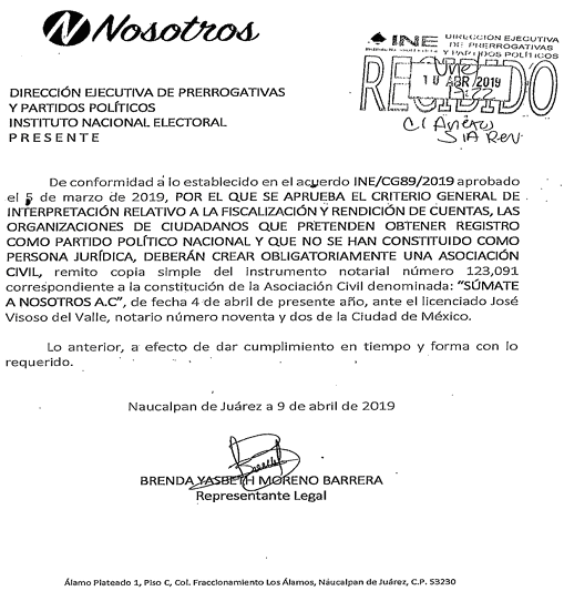 No pasa de inadvertido que el dos de abril de dos mil diecinueve y derivado de la aprobación por parte de este Órgano del Acuerdo (Criterio general de interpretación relativo a la fiscalización y rendición de cuentas por el que se establece que las organizaciones de ciudadanos que pretenden su registro como Partido Político Nacional y que no han constituido la asociación civil respectiva, deberán crear obligatoriamente una) identificado como INE/CG89/2019, la organización denominada "Nosotros" voluntariamente se registró como Súmate a Nosotros, A.C.