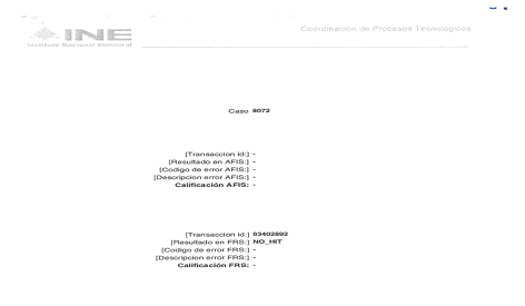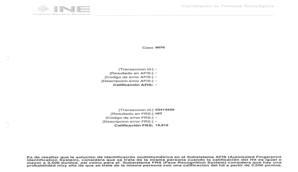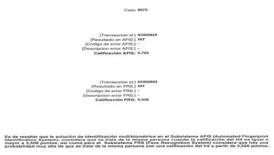 22 Los términos NO HIT y HIT se refieren al resultado negativo y positivo respectivamente de la comparación entre personas derivado de las soluciones de identificación multibiométrica en los Subsistemas AFIS (Automated Fingerprint Identificatios System) para huellas dactilates, y Subsistema FRS (Face Recognition System), para reconocimiento facial.