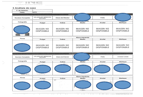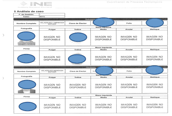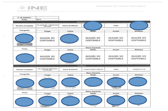 todo, además de que los registros del Instituto son vulnerables a errores pues de la comparación biométrica por huellas dactilares e imágenes faciales para la identificación de los ciudadanos en el caso 8072 se desprende que no son la misma persona Esther Velázquez "y" Mendoza y Esther Velázquez Mendoza pues la fotografía y firmas son diferentes, y en la conclusión se dice que hay probabilidad muy alta de que se trate de la misma persona.