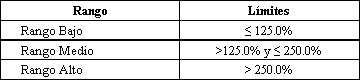 Artículo Sexto. Los valores que determinan los límites de los rangos bajo, medio y alto del indicador de Obligaciones a Corto Plazo y Proveedores y Contratistas, menos los montos de efectivo, bancos e inversiones temporales, sobre Ingresos totales a que se refiere el artículo 44, fracción III de la Ley de Disciplina Financiera de las Entidades Federativas y los Municipios y el artículo 6, fracción III del Reglamento del Sistema de Alertas, de los Entes Públicos distintos a la administración pública centralizada de los Municipios, son: