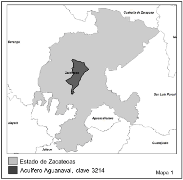 El acuífero Aguanaval, clave 3214, se localiza al noroeste de la Ciudad de Zacatecas (Mapa 1), con una superficie de 2,804 kilómetros cuadrados; se circunscribe en los municipios de Fresnillo con el 74.7 por ciento; Saín Alto con el 16.3 por ciento; Jerez con el 4.5 por ciento; Valparaíso con el 2 por ciento; Río Grande con el 1.4 por ciento y Cañitas de Felipe Pescador con el 1.1 por ciento. Administrativamente, corresponde a la Región Hidrológico-Administrativa VII, Cuencas Centrales del Norte.