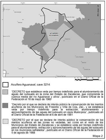 c) "DECRETO por el que se declara de interés público la conservación de los mantos acuíferos en las zonas no vedadas, así como en el resto de los Municipios del Estado de Zacatecas y se establece veda por tiempo indefinido para el alumbramiento, extracción y aprovechamiento de las aguas del subsuelo en los municipios señalados", publicado en el Diario Oficial de la Federación el 5 de agosto de 1988, cuyas disposiciones aplican en las áreas norte y sur del acuífero Aguanaval, clave 3214;