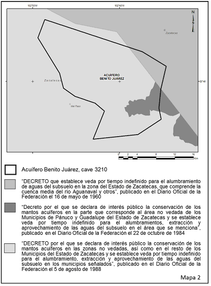 c) "DECRETO por el que se declara de interés público la conservación de los mantos acuíferos en las zonas no vedadas, así como en el resto de los Municipios del Estado de Zacatecas y se establece veda por tiempo indefinido para el alumbramiento, extracción y aprovechamiento de las aguas del subsuelo en los municipios señalados", publicado en el Diario Oficial de la Federación el 5 de agosto de 1988, cuyas disposiciones aplican en la mayor parte de la extensión del acuífero Benito Juárez, clave 3210;