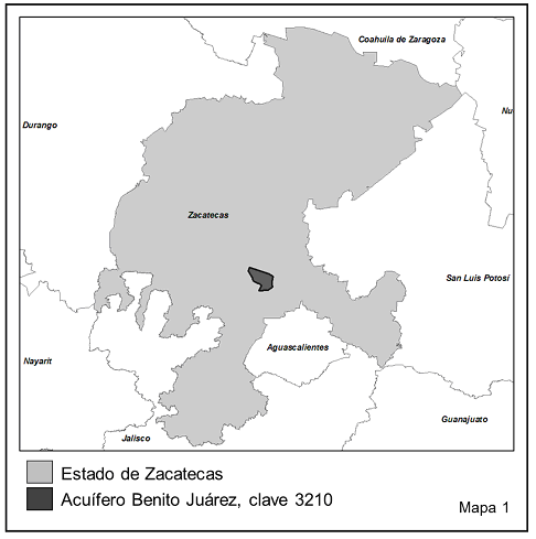 El acuífero Benito Juárez, clave 3210, se localiza al suroeste de la Ciudad de Zacatecas, en la porción central del Estado de Zacatecas Mapa 1). El acuífero abarca una superficie de 351 kilómetros cuadrados y se localiza en su mayor parte en el municipio de Zacatecas, además abarca pequeñas áreas de los municipios Guadalupe, Jerez, Genaro Codina y Villanueva. Administrativamente, corresponde a la Región Hidrológico-Administrativa VII, Cuencas Centrales del Norte.