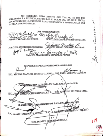 EN LA CIUDAD DE LA PAZ, CAPITAL DEL ESTADO DE BAJA CALIFORNIA SUR, SIENDO LAS 11 HORAS DEL DIA 7 DE ENERO DE 1997, SE REUNIERON EN LA SALA DE JUNTAS DE LA SUBSECRETARIA DE FOMENTO ECONOMICO Y PRODUCTIVIDAD, LOS CC. FEDERICO CARLON PEREZ, JOSE ADELAIDO, SANCHEZ GONZALEZ, JORGE RICARDO CORDERO CORDERO, SANTOS MARIO CORDERO AGUILAR, ESTOS DOS ULTIMOS ASISTIDOS POR EL LIC. FLAVIO DIBENI AGUILAR Y BLANCA MARGARITA GONZALEZ NUÑEZ ASISTIDA POR LA LIC. ARMIDA UNZON CAMACHO, POSESIÓNARIOS PREDIO "JESUS MARIA", UBICADO EN LA DELEGACION MUNICIPAL DE SAN ANTONIO, MUNICIPIO DE LA PAZ; ING. VICTOR MANUEL JUVERA GAXIOLA E ING. RAUL MORENO GARIBAY EN REPRESENTACION DE LA EMPRESA MINERA PAREDONES AMARILLOS, S.A. DE C.V.; ING. JUAN JOSE FLORES GONZALEZ E ING. ANTONIO BELTRAN COTA POR LA COORDINACION AGRARIA EN EL ESTADO Y LIC. AGAPITO DUARTE HERNANDEZ, LIC. ANGELA GUADALUPE ABASCAL TOLEDO E ING. DANIEL DIBENE ARREOLA EN REPRESENTACION DEL GOBIERNO DEL ESTADO, PARA SOSTENER LA