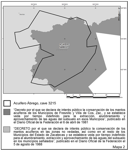a) "Decreto por el que se declara de interés público la conservación de los mantos acuíferos de los Municipios de Fresnillo y Villa de Cos, Zac., y se establece veda por tiempo indefinido para la extracción, alumbramiento y aprovechamiento de las aguas del subsuelo en esos Municipios", publicado en el Diario Oficial de la Federación el 6 de abril de 1981, cuyas disposiciones aplican en las áreas central y oriente del acuífero Ábrego, clave 3215, y