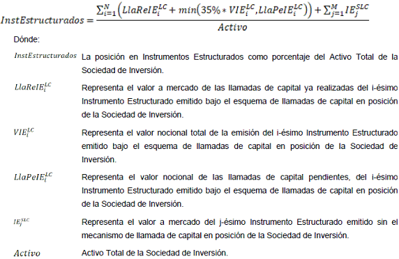 las llamadas de capital pendientes del Instrumento Estructurado emitido bajo el mecanismo de llamadas de capital, respecto al Activo Total de la Sociedad de Inversión, es decir, para cada Sociedad de Inversión para computar las inversiones en Instrumentos Estructurados, se calcula la suma de i) el valor a mercado del monto total invertido por dicha sociedad de inversión y, ii) el 35% del monto comprometido inicialmente por la sociedad de inversión. La suma de los factores anteriores no excederá del 100% del monto comprometido inicialmente por la sociedad de inversión; por lo que el cómputo se deberá realizar de la siguiente manera: