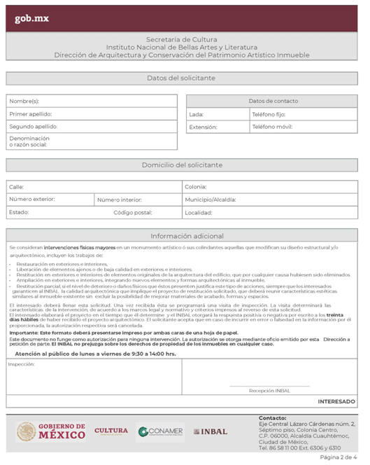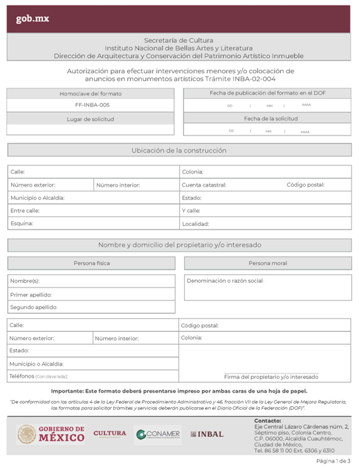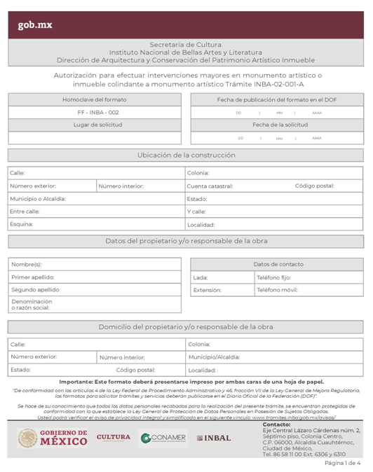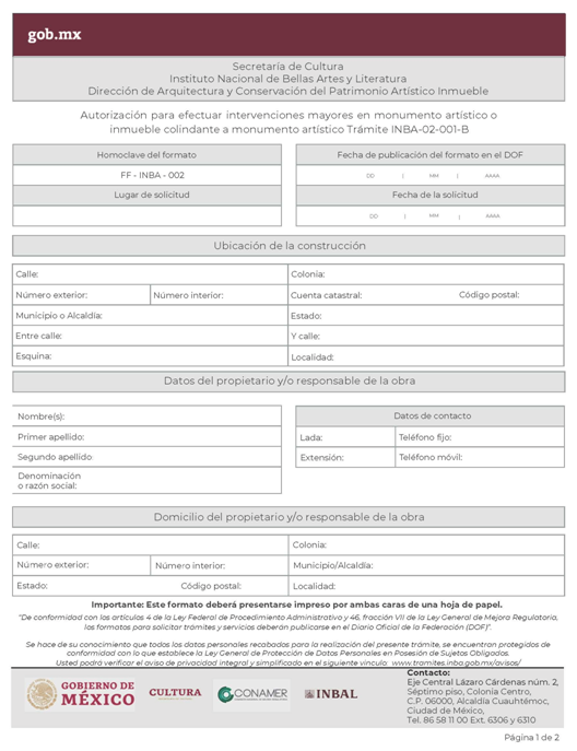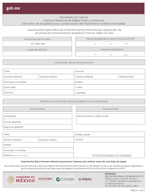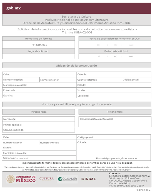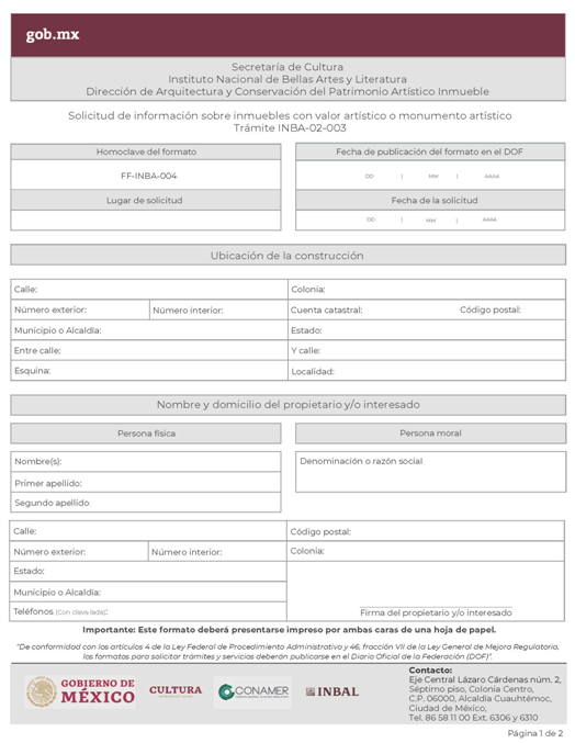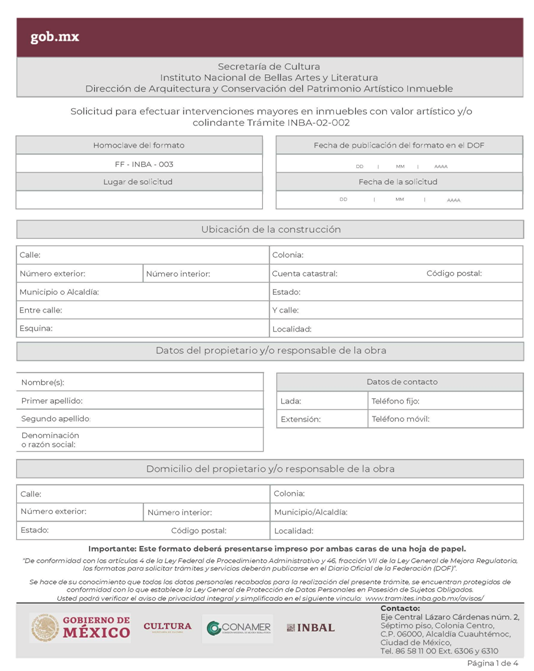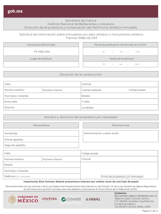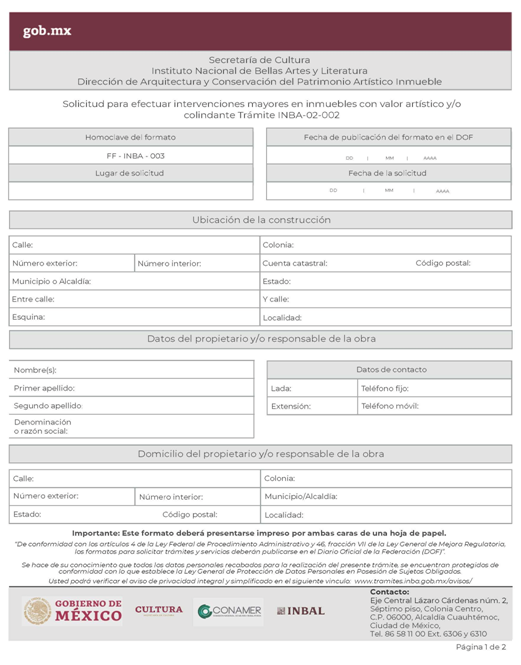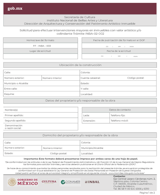 | INBA-02-002 | Solicitud para efectuar intervenciones mayores en inmuebles con valor artístico y/o colindante. | Interesado Solicitud para efectuar intervenciones mayores en inmuebles con valor artístico y/o colindante. |