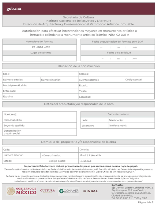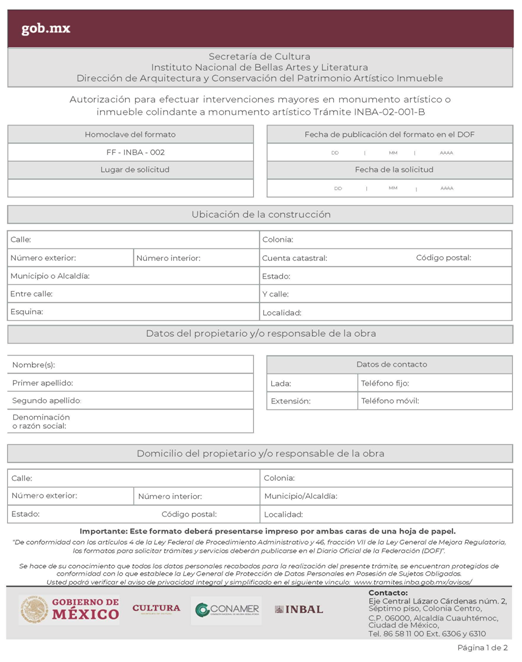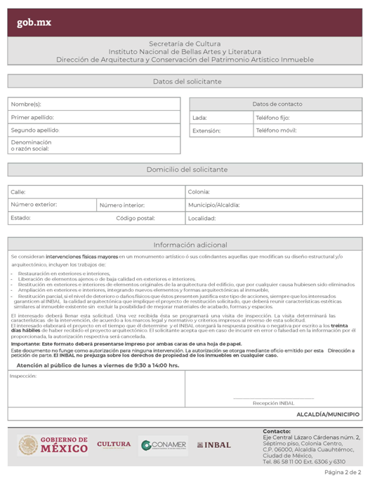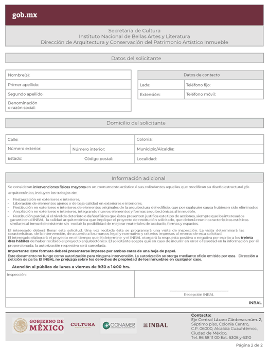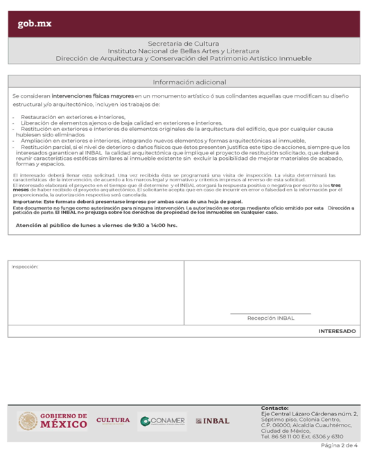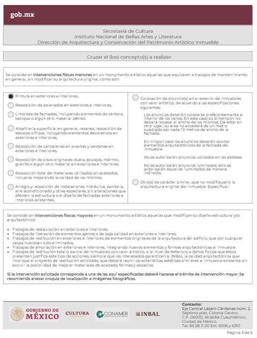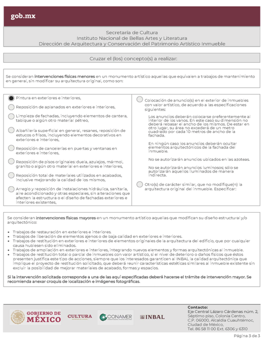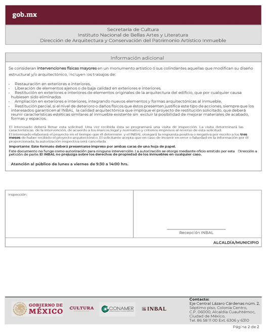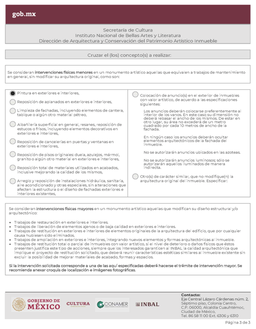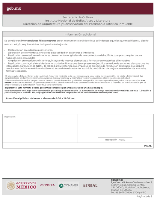 | INBAL Autorización para efectuar intervenciones mayores en monumento artístico o inmueble colindante a monumento artístico. | ||