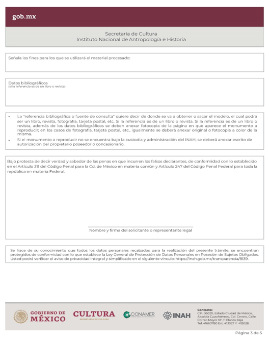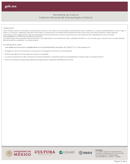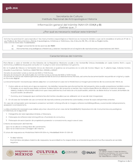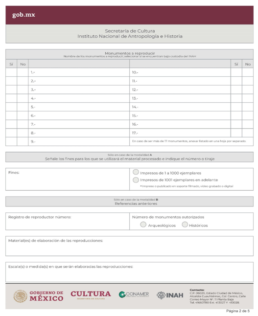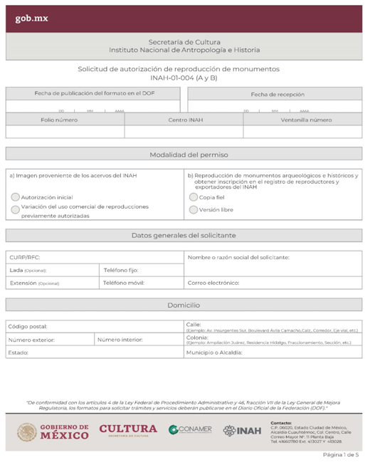 | INAH-01-004- (A y B) | Solicitud de autorización de reproducción de monumentos. Modalidad A: Imagen proveniente de los acervos del INAH. Modalidad B: Reproducción de monumentos arqueológicos e históricos y obtener inscripción en el registro de reproductores y exportadores del INAH. | Solicitud de autorización de reproducción de monumentos. |